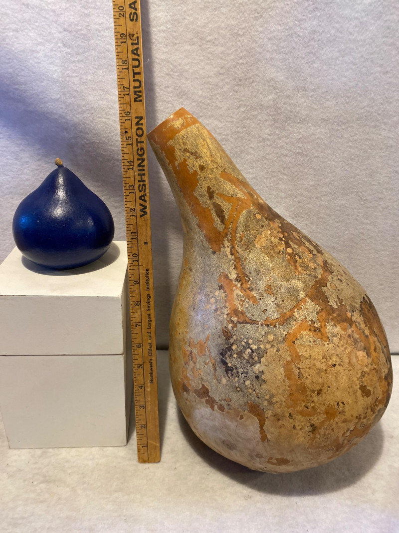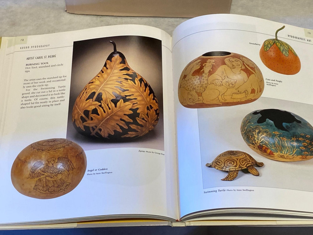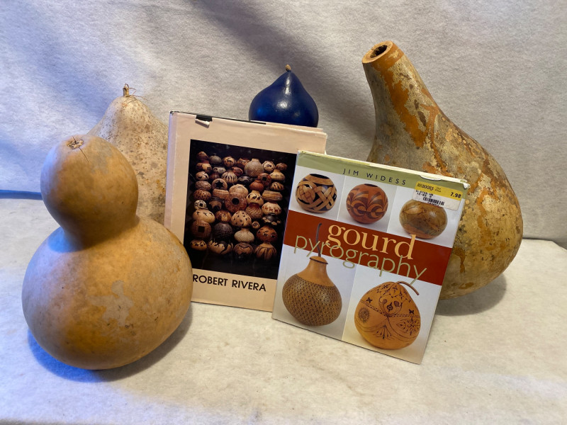 A hands-on harvest for the creatively inclined! This lot includes: Five natural gourds, each with its own sculptural personality—one painted blue, the rest ripe for carving, burning, or painting. Two how-to books: Robert Rivera – A visual feast of intricately decorated gourds by the renowned artist. Gourd Pyrography by Jim Widess – A practical guide to burning designs into gourds, with templates and techniques for beginners and pros alike. Whether you're a seasoned pyrographer or a curious crafter, this lot offers both raw material and artistic mentorship. A perfect pairing of nature and know-how.