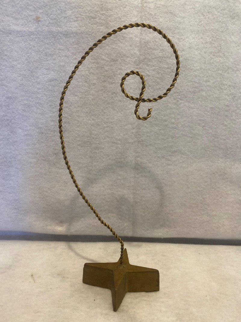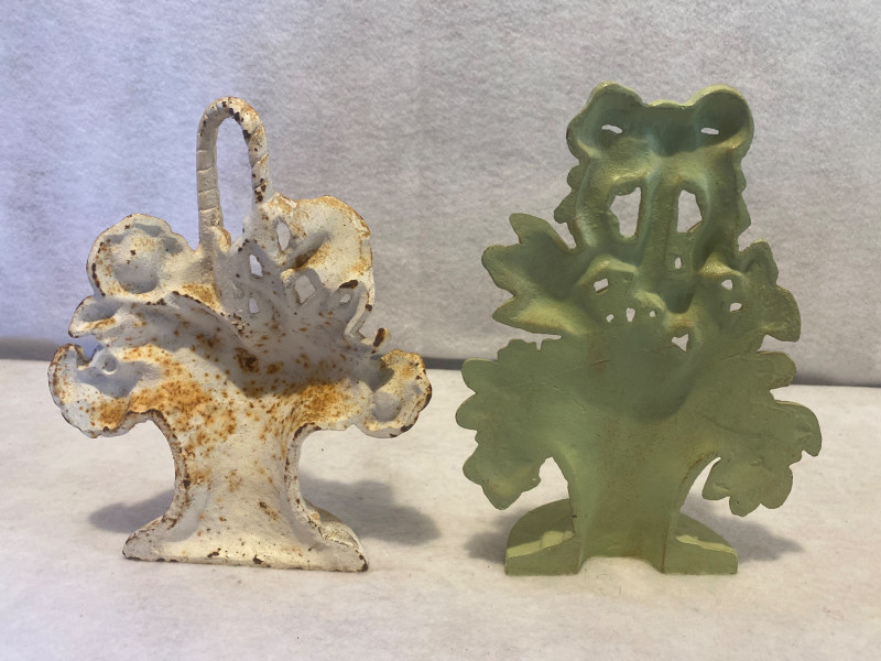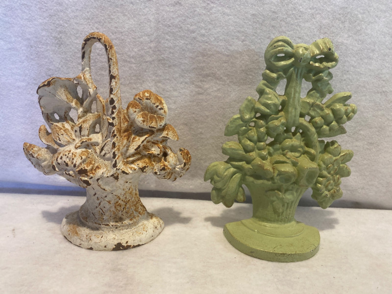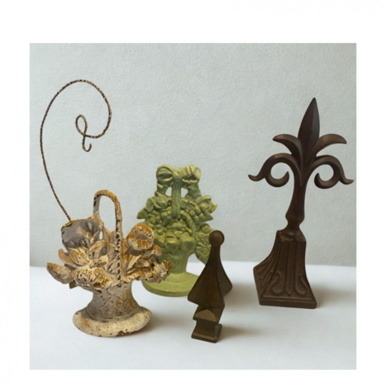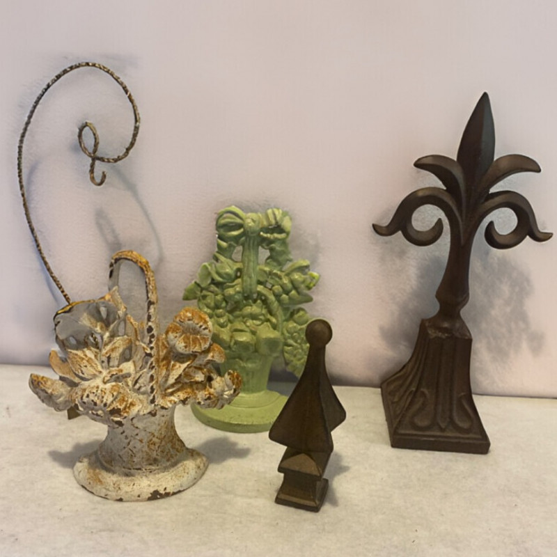 Trio of cast iron decorative pieces, perfect for adding vintage flair and functional charm to your home or garden: Fleur-de-Lis Wall Accent Measures approx. 15" H Classic French-inspired design with rustic finish Ideal for wall display or architectural décor Two Cast Iron Doorstops Heights: approx. 9½" H and 10" H Sturdy and sculptural, with traditional styling Functional and collectible Cast Iron Display Hook Measures approx. 15" H Great for hanging lanterns, plants, or decorative items Adds a touch of farmhouse or garden charm All pieces are solid cast iron with aged patina. A versatile lot for decorators, collectors, or lovers of timeless metalwork.