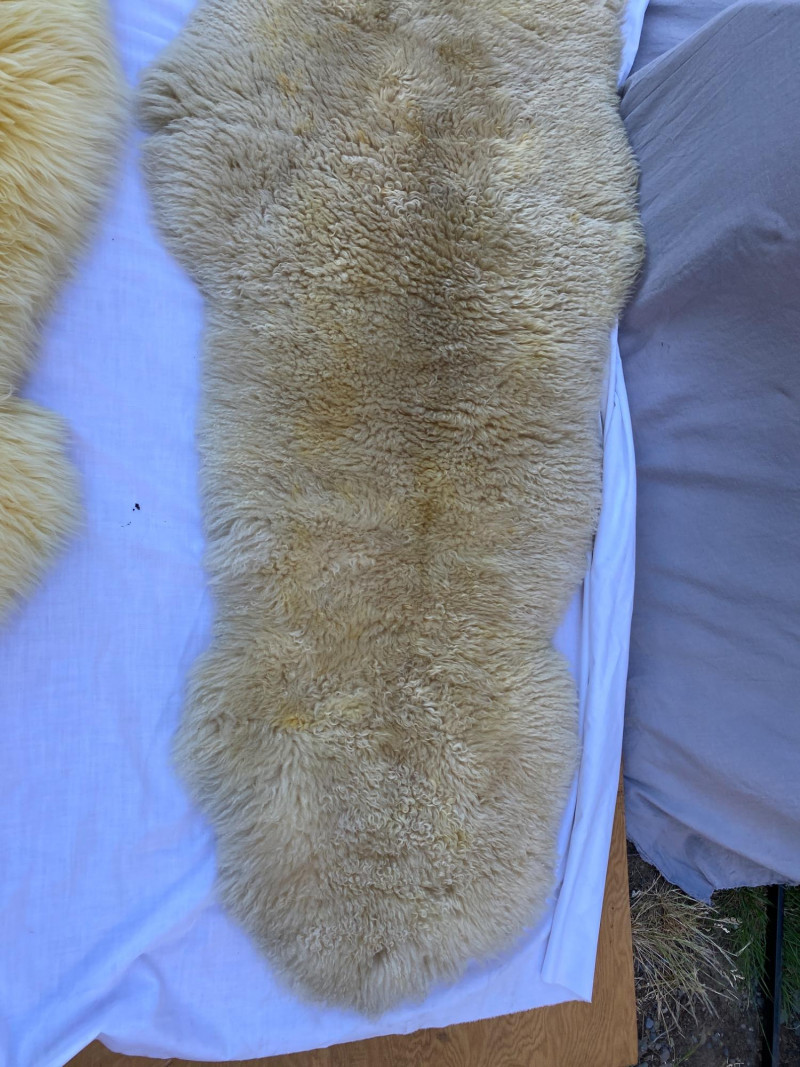 This lot includes two sheepskin rugs: Perfect for layering in rustic or boho interiors.