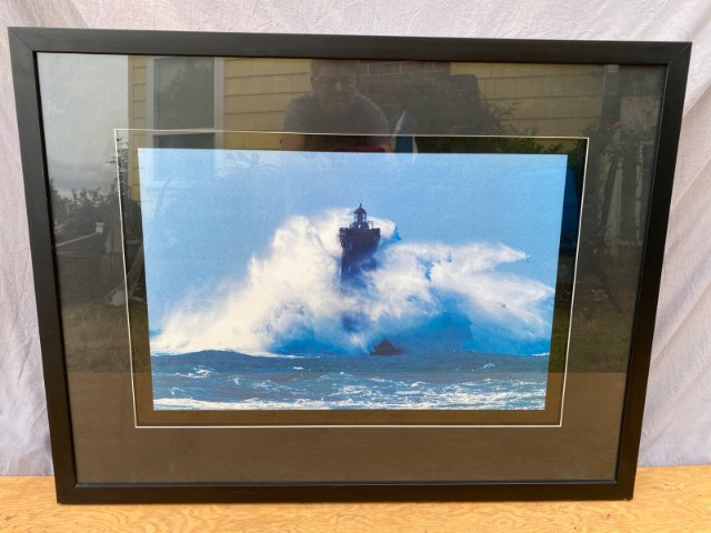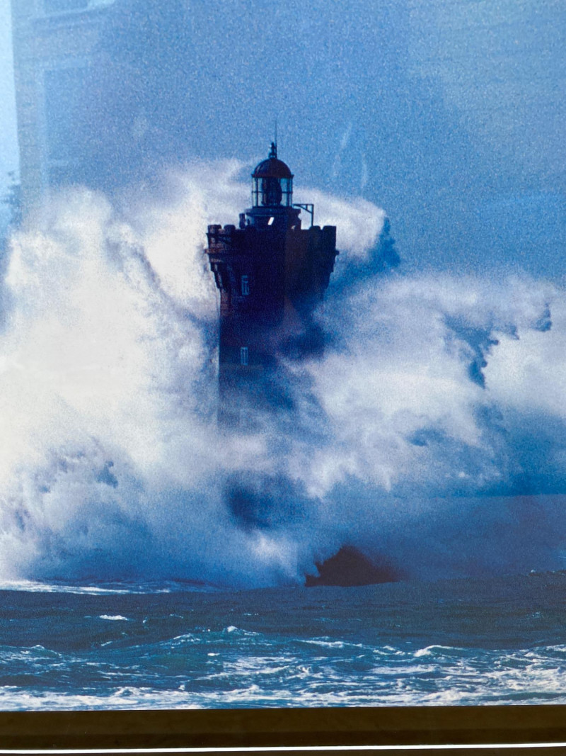 A well-framed print depicting a lighthouse weathering a storm. Dramatic and atmospheric.