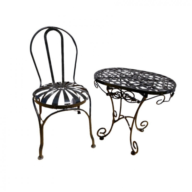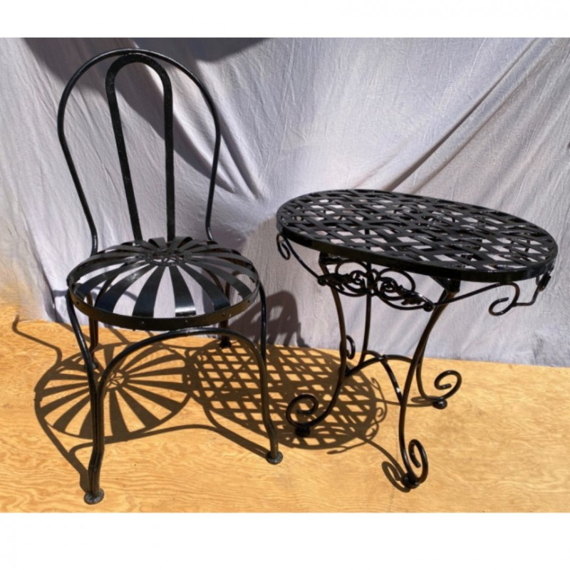 A sturdy garden chair, non-vintage but built to last. Ideal for outdoor seating. Chair height at back 32 inches…table height 21 inches.