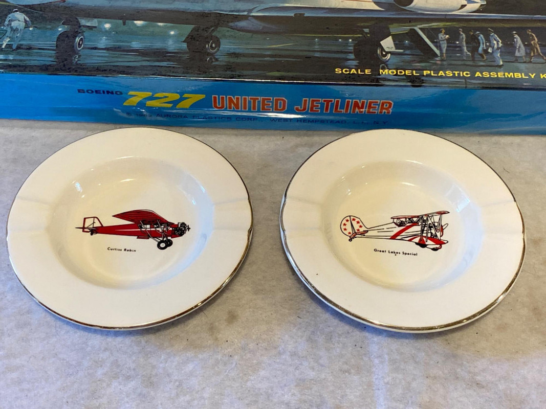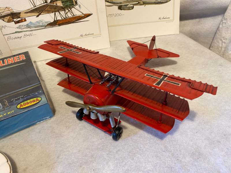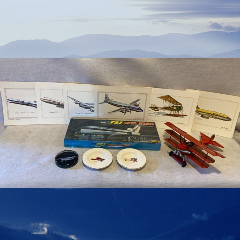 A nostalgic flight through aviation history, this eclectic lot includes: A Spirit of St. Louis paperweight Two vintage ashtrays with aviation themes A Red Baron Triplane decorative piece An Aurora 727 model airplane, appears complete with stand (not verified) Six 12" x 9" aviation prints on quality card stock, ready to frame From barnstormers to jetliners, this collection captures the romance of flight in desk-sized form. Ideal for collectors, decorators, or anyone with a soft spot for sky-bound stories.