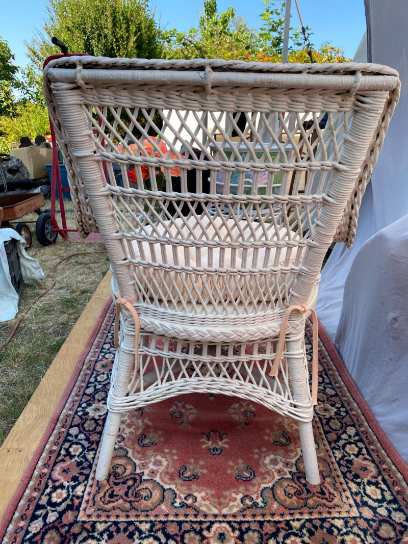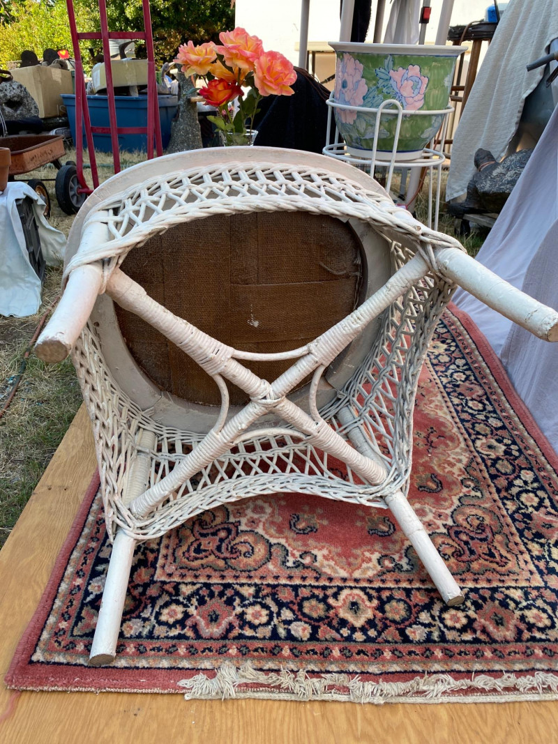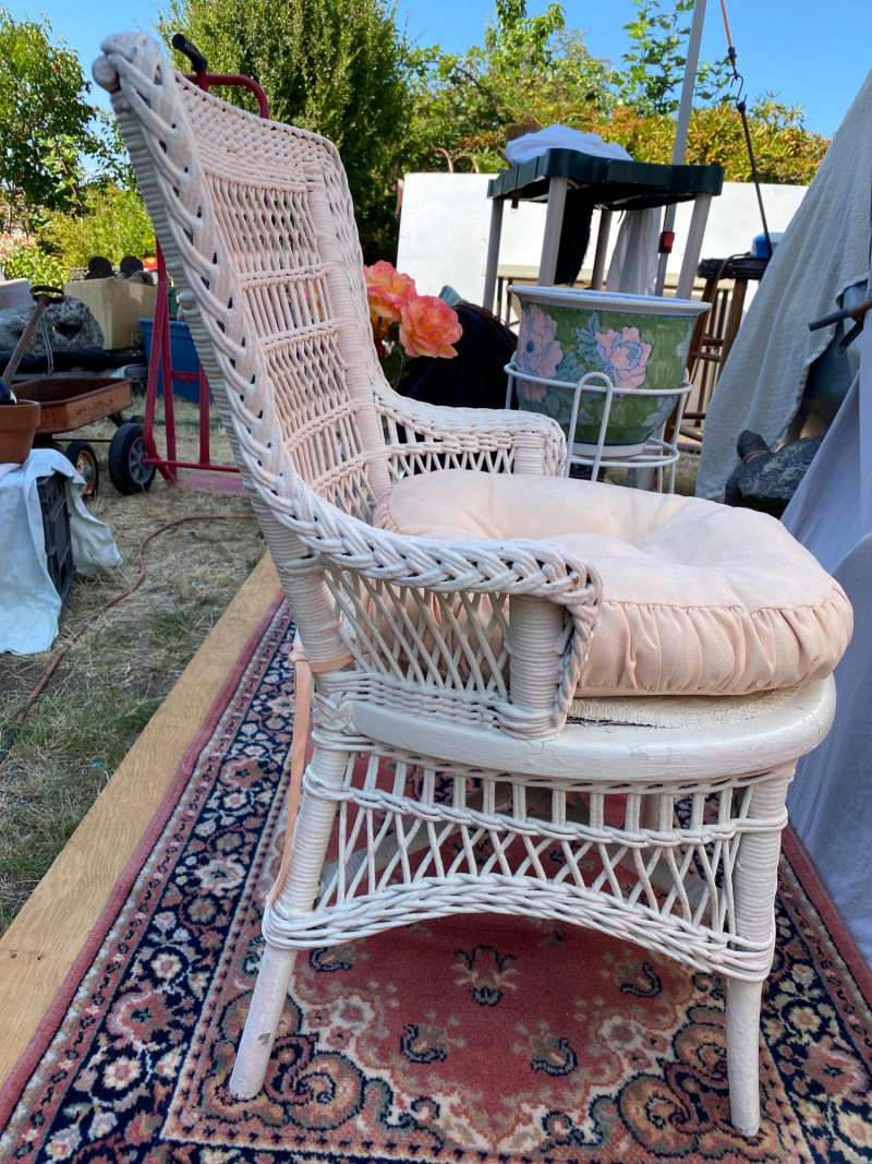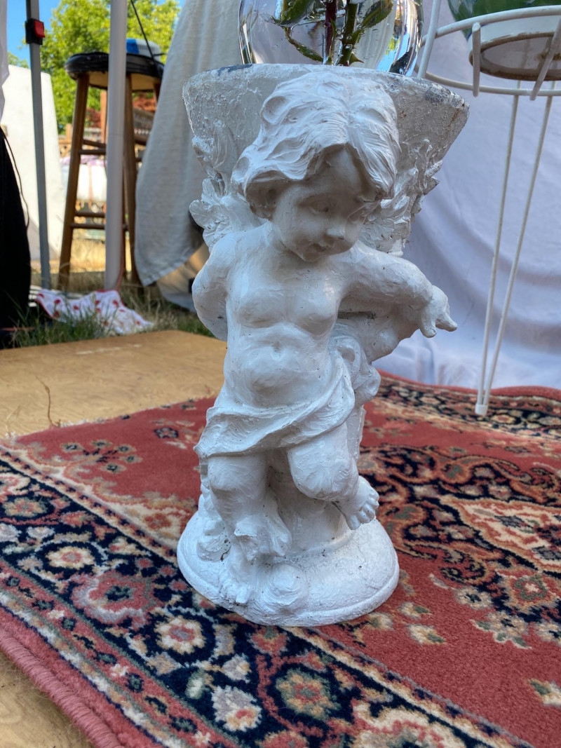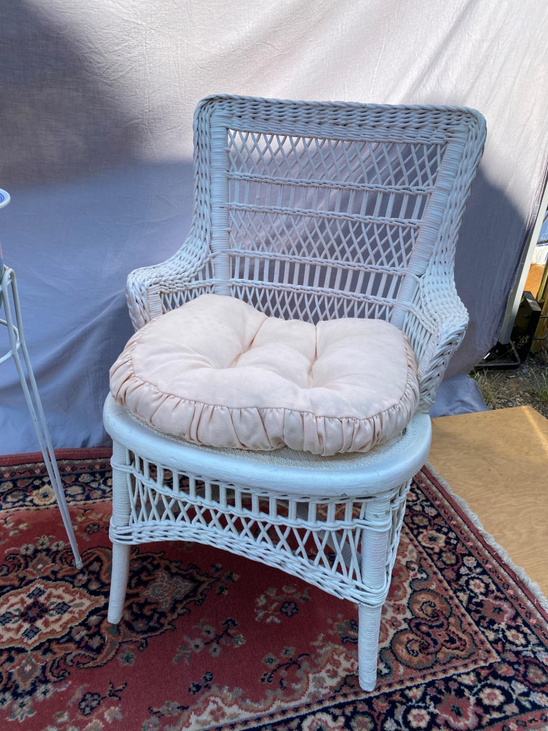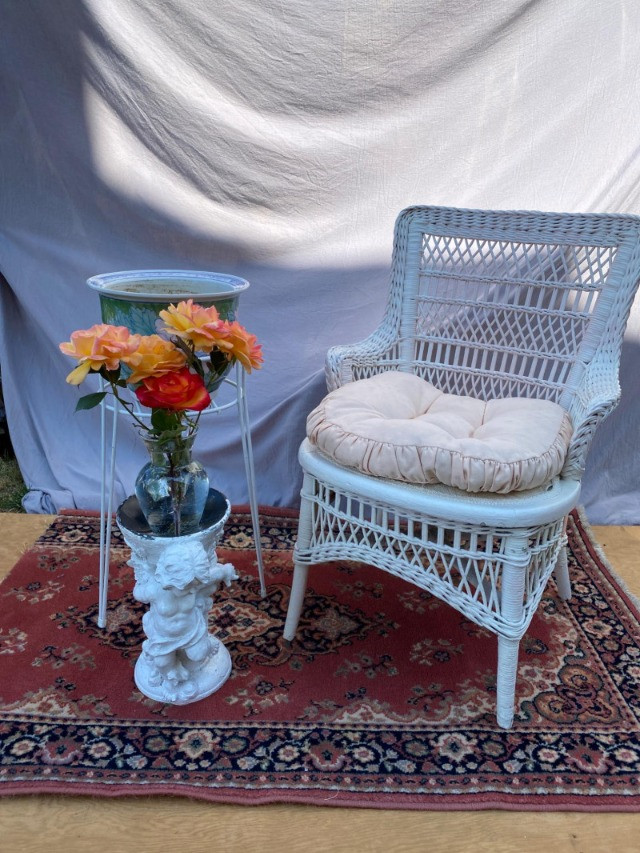 This inviting wicker chair and plant stand ensemble blends porch comfort with garden charm. The chair is very sturdy, with a back height of 29½ inches and a seat height of 15 inches, ideal for relaxed seating or decorative staging. The plant stand, measuring 24½ inches tall, includes a pot and a resin putti statue, adding a touch of classical whimsy. Whether used indoors or out, this lot offers a vignette-ready pairing for cottagecore, garden, or vintage-inspired spaces.