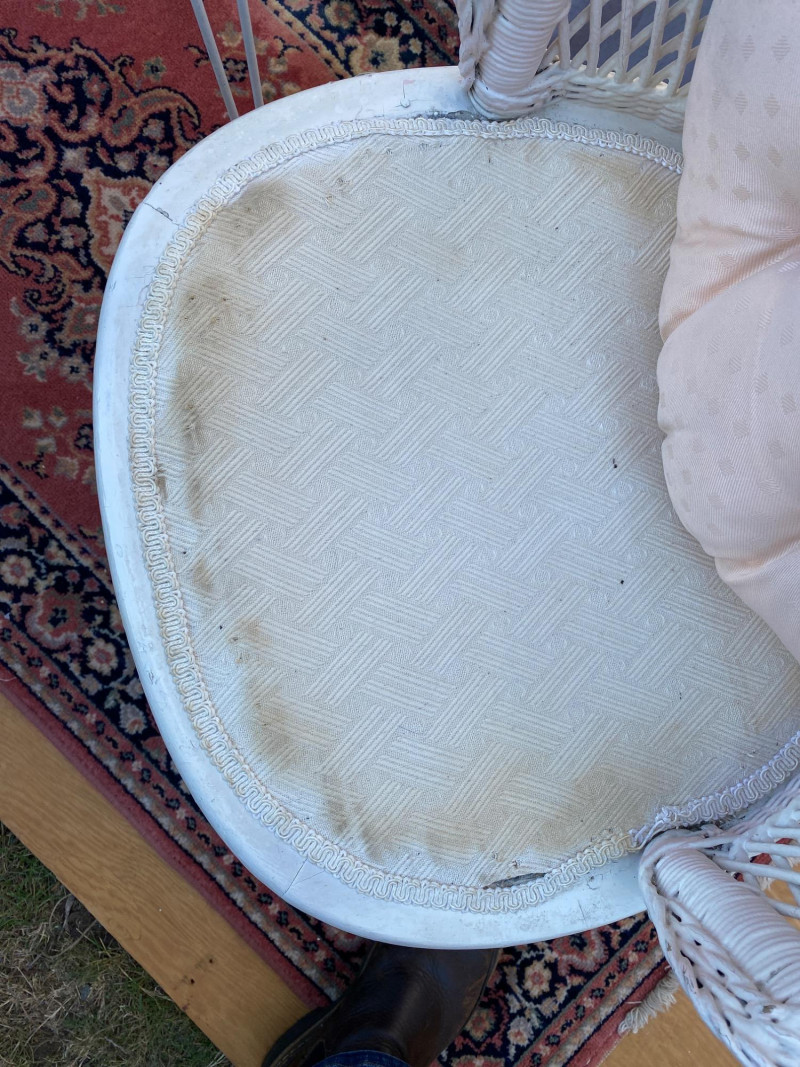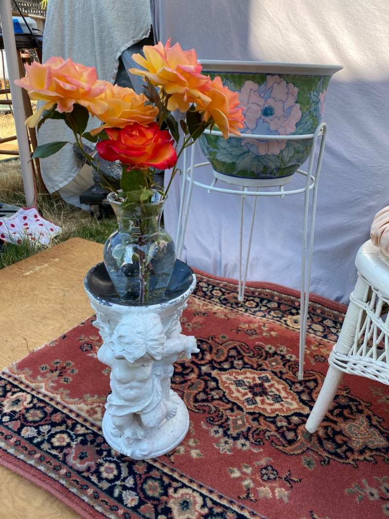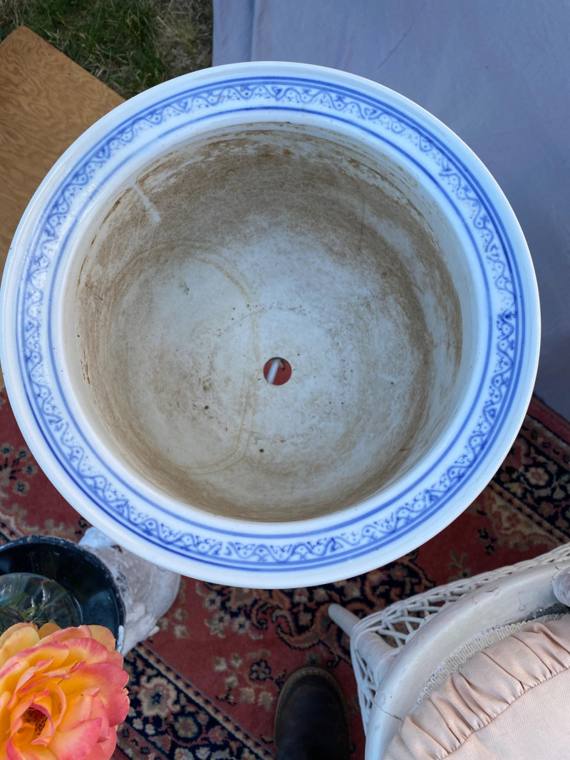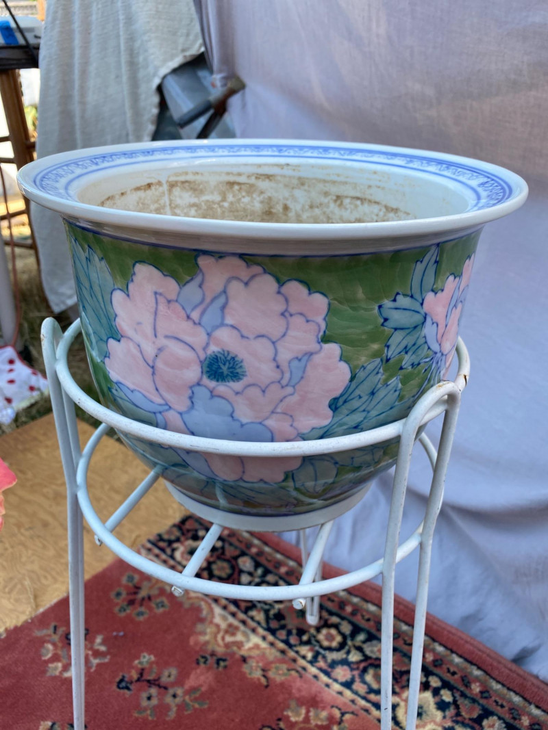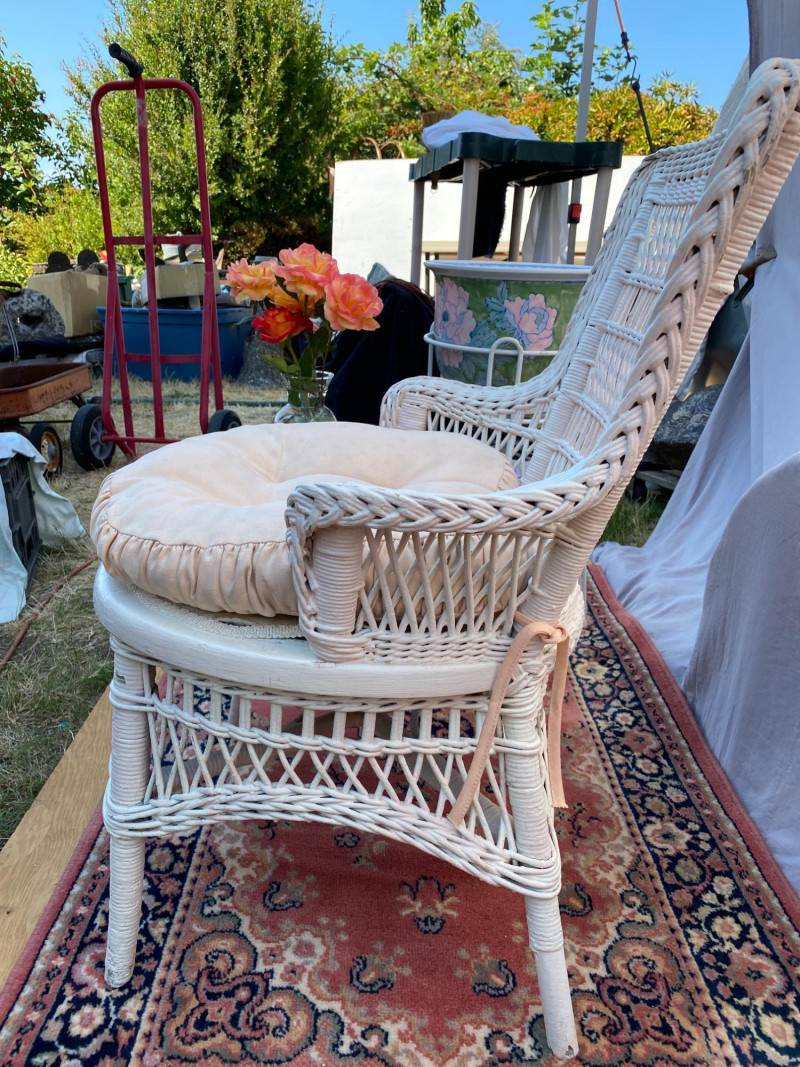 This inviting wicker chair and plant stand ensemble blends porch comfort with garden charm. The chair is very sturdy, with a back height of 29½ inches and a seat height of 15 inches, ideal for relaxed seating or decorative staging. The plant stand, measuring 24½ inches tall, includes a pot and a resin putti statue, adding a touch of classical whimsy. Whether used indoors or out, this lot offers a vignette-ready pairing for cottagecore, garden, or vintage-inspired spaces.