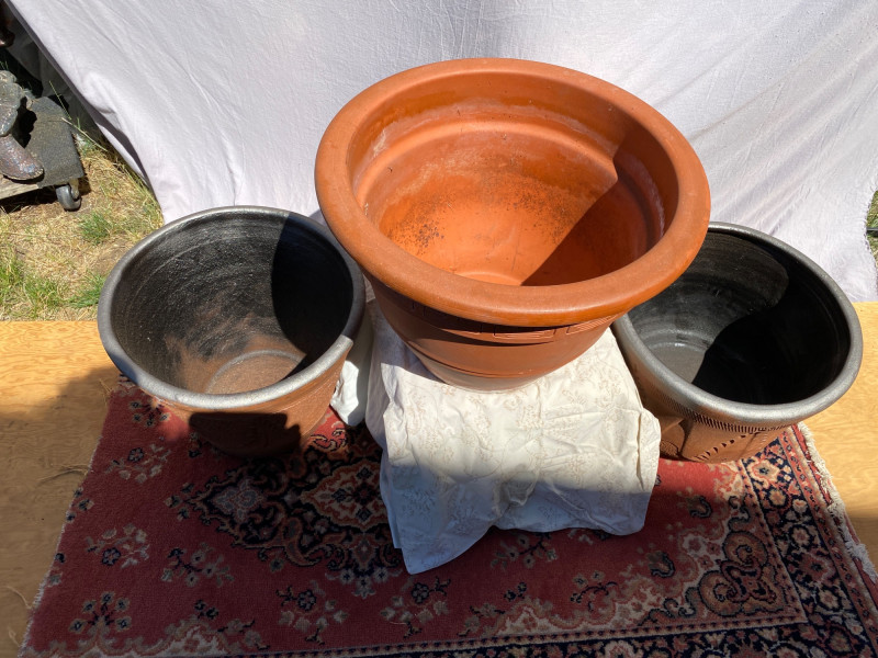 A striking set of three large red clay pots, each with its own earthy presence and generous proportions: Center pot: 12½″ tall × 18″ across Left pot: 12″ tall × 16″ across Right pot: 11½″ tall × 15″ across Ideal for garden staging, patio decor, or rustic interior design, these vessels offer timeless form and natural texture. Their scale and symmetry make them perfect for grouped display or standalone impact.