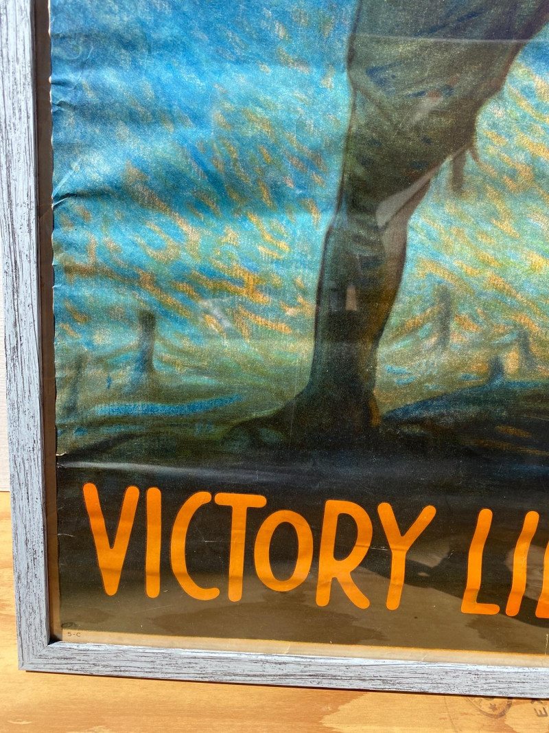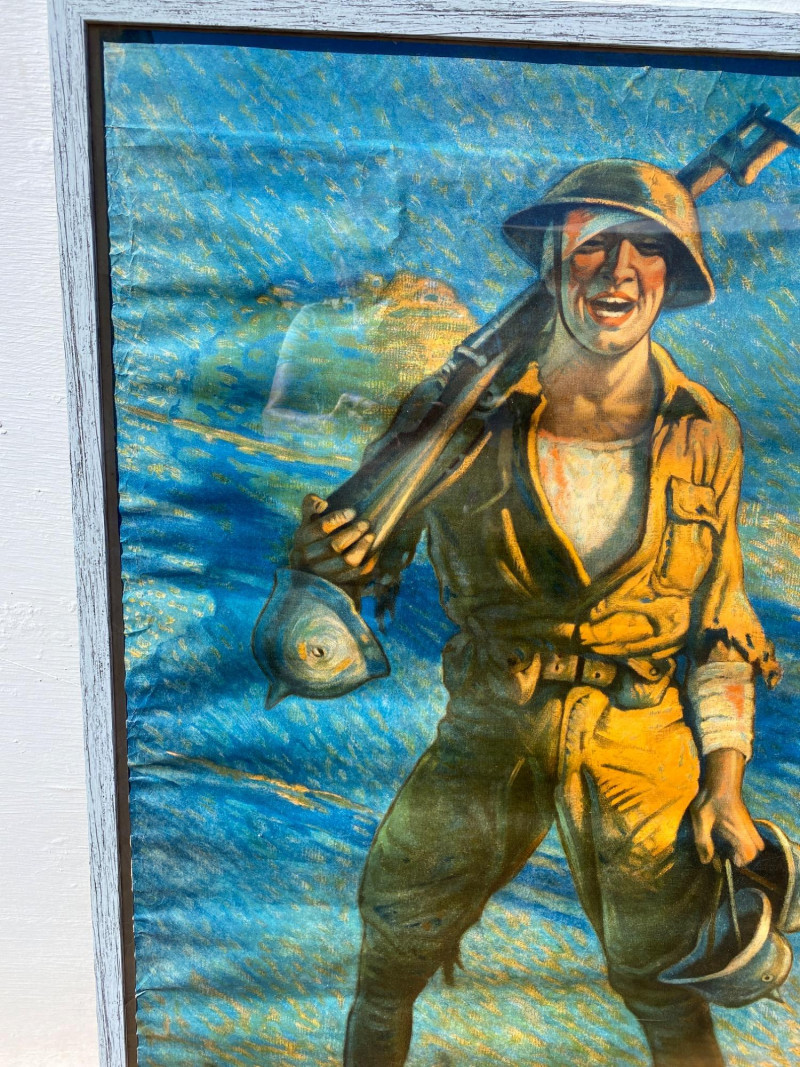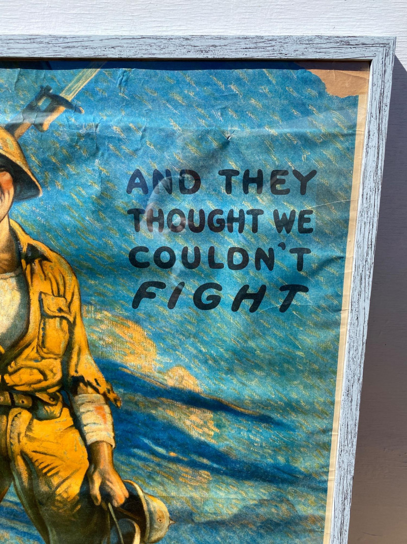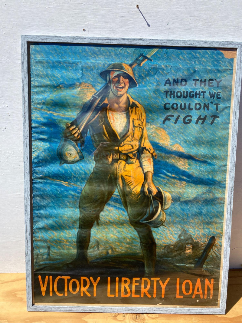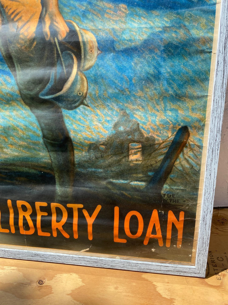 This vibrant and historically significant World War I poster features artwork by renowned illustrator Clyde Forsythe. The colors remain exceptionally bright, preserving the urgency and patriotic spirit of the era. Though it shows minor damage (visible in the images), the poster has been carefully stored rolled up for over 60 years, contributing to its well-preserved condition. It is professionally framed, measuring 41¼" x 31¼", ready for display in any collector’s gallery or historical archive. Artist bio: Victor Clyde Forsythe (1885–1962) was an American illustrator and painter best known for his World War I propaganda posters and evocative desert landscapes. Born in Orange, California, Forsythe grew up surrounded by Western lore—his parents once ran a store next to the O.K. Corral in Tombstone, Arizona. He studied at the Los Angeles School of Art & Design and later at the Art Students League in New York under Frank DuMond. Forsythe began his career as a cartoonist for major newspapers including the New York World and New York Journal, where he became a prominent figure in early American comic art. He was also a mentor and studio-mate to Norman Rockwell, helping launch Rockwell’s career at The Saturday Evening Post. In the 1920s, Forsythe left the bustling East Coast art scene to focus on painting the California desert, becoming one of the original “Desert Painters.” His work captures both the stark beauty and rugged spirit of the American Southwest.