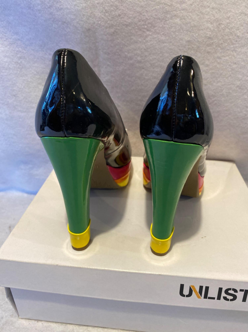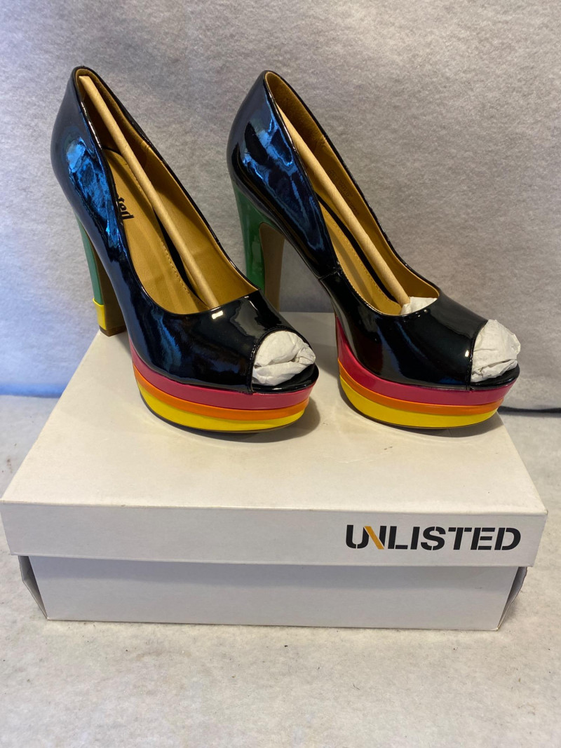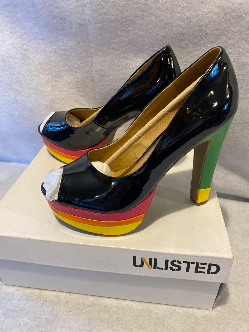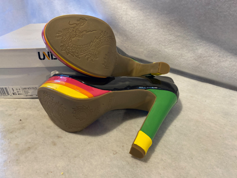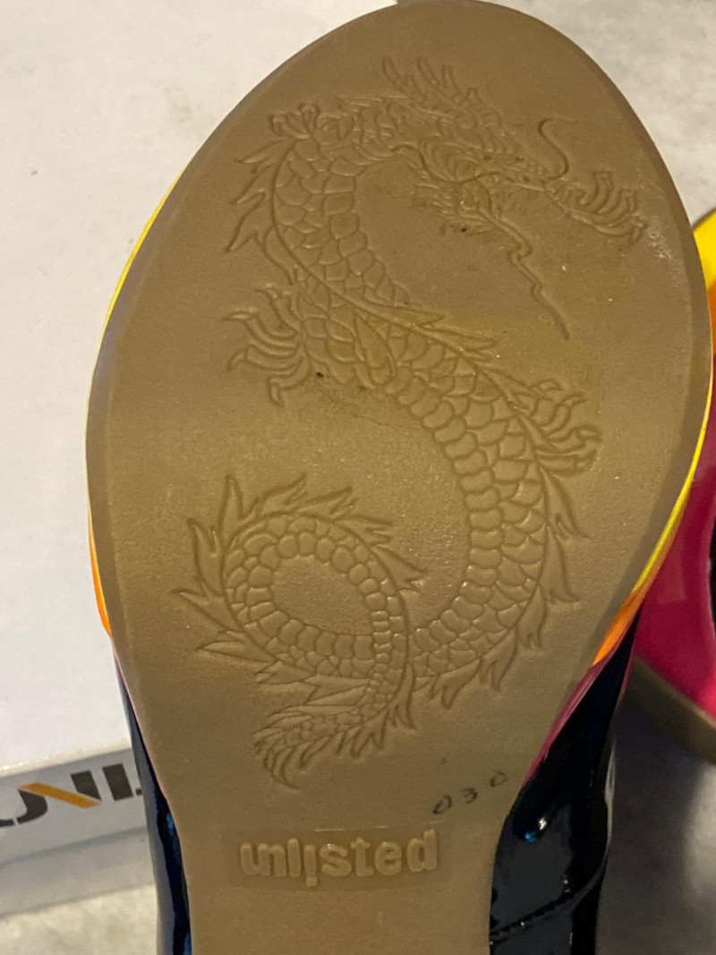 Heel height: 5¼ inches of unapologetic altitude. These dazzling disco shoes aren’t just footwear—they’re a celebration on stilts. Hidden beneath the sole lies a dragon, not fierce but fabulous—etched like a secret emblem of confidence and flair. Whether you wear them to conquer the dance floor or perch them on a pedestal, they’re pure spectacle with a wink of wild.