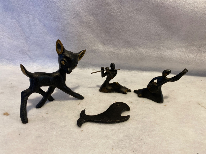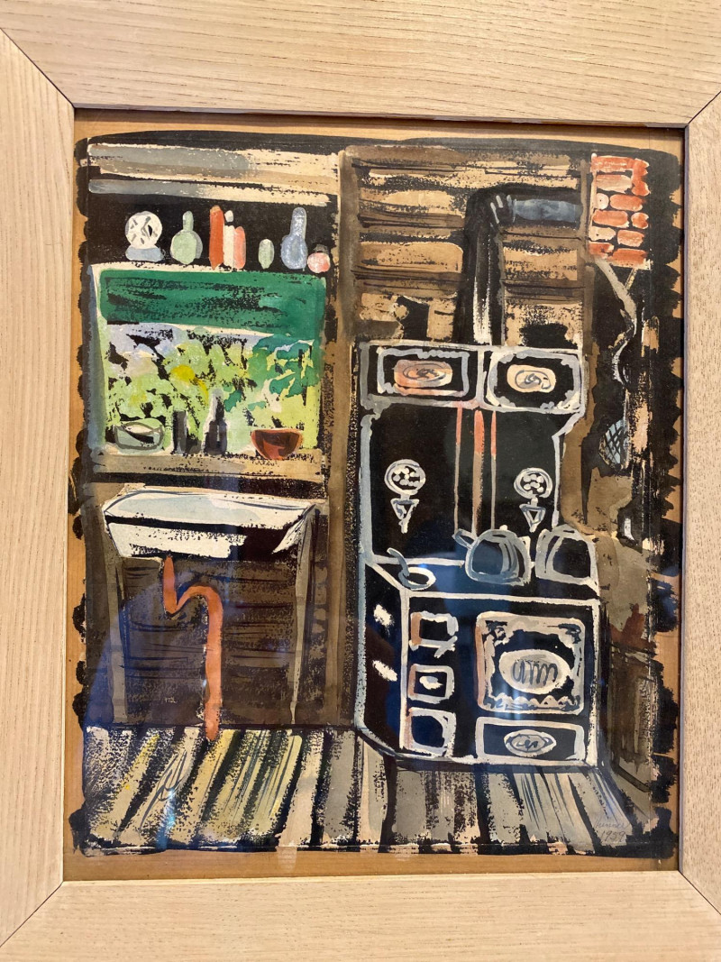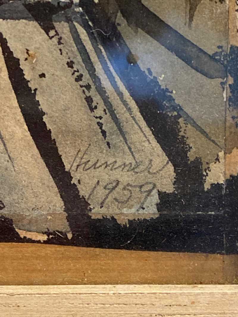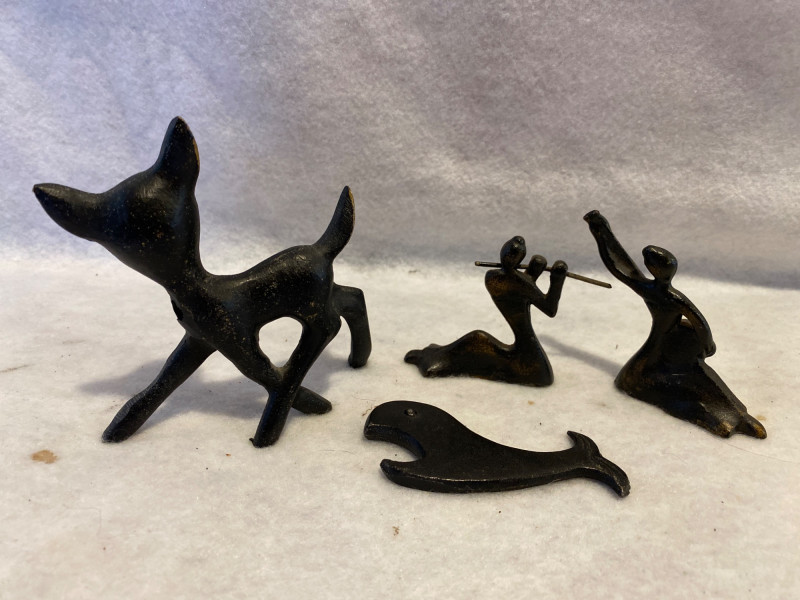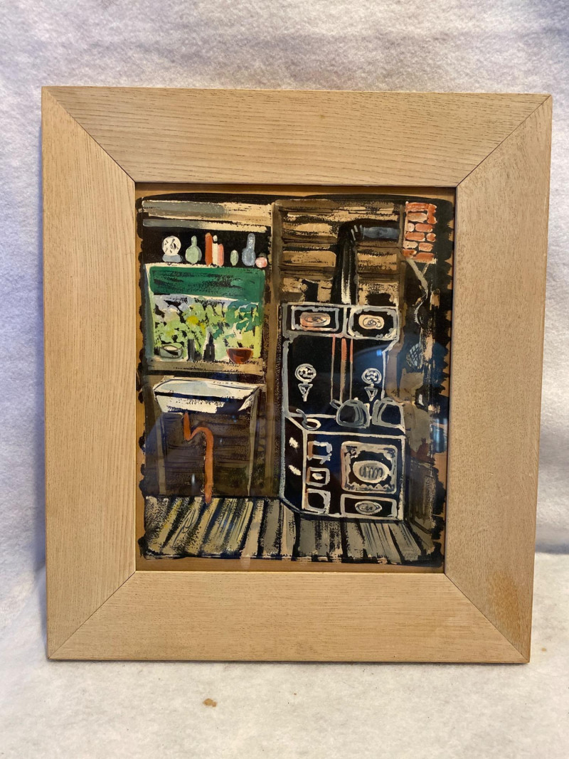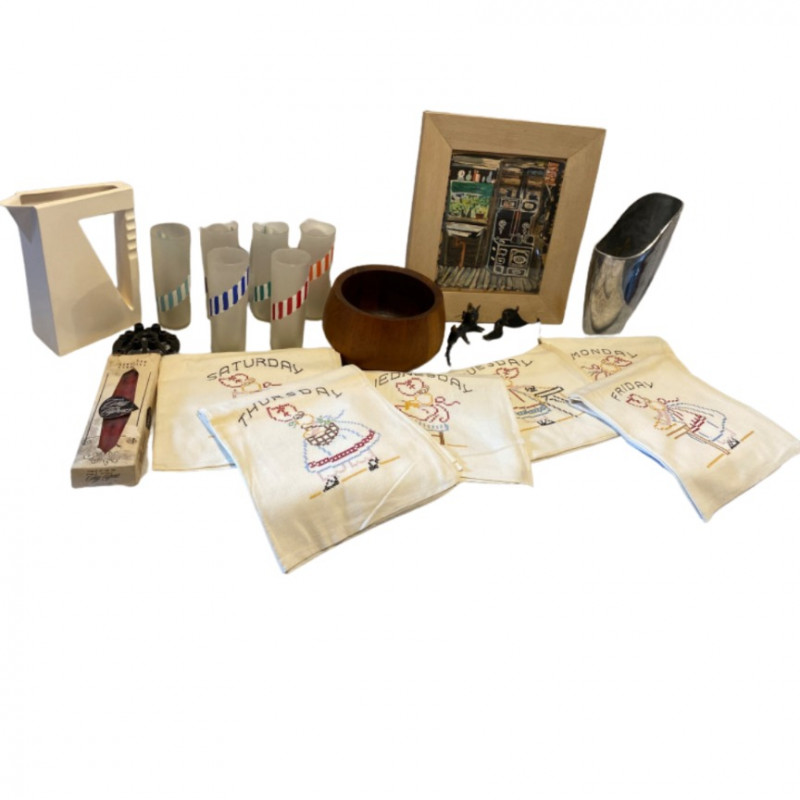 A curated collection of mid-century modern charm, this eclectic lot includes: Cast iron candle holder made in Japan, with tapers Claude Dumas modernist pitcher (9½″ × 6″ × 3″) Six skinny glasses in assorted colors (7″ tall × 2½″ across) Dansk salad bowl (5″ tall × 7½″ across) 1959 kitchen scene painting signed “Hunner” in original frame (15″ × 13″) Cast iron figures, 3″ and smaller, including a fish bottle opener Anna Everlund aluminum vase (11″ × 3½″ × 7½″) Cross-stitched kitchen towels, gently aged with fold marks—no Sunday towel, because that’s your day of rest! A delightful blend of form, function, and nostalgia—perfect for collectors, decorators, or lovers of MCM storytelling.