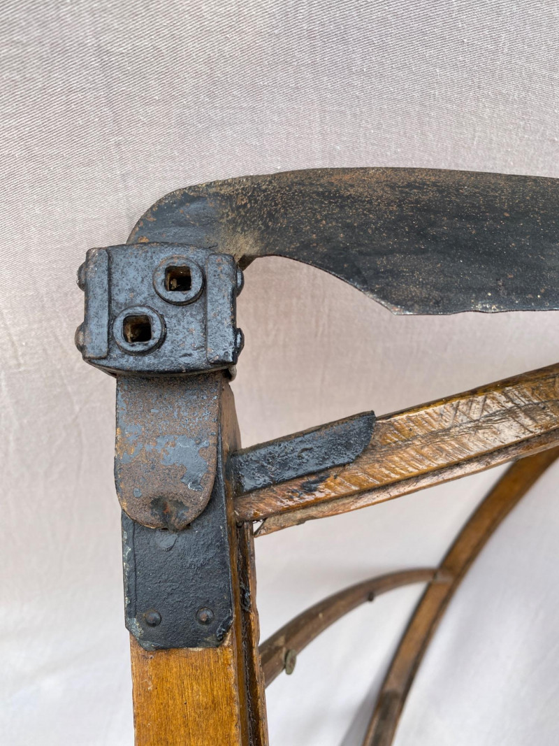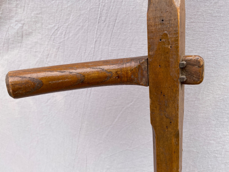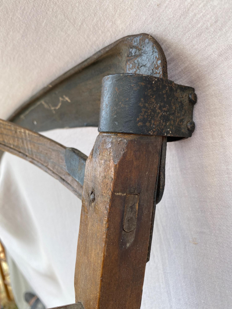 Standing 64″ tall and 19″ at its widest, this traditional Amish cradle snathe was designed to hold the scythe blade steady while cutting. Its elegant curvature and utilitarian form speak to generations of craftsmanship and agrarian rhythm. Whether displayed as a sculptural piece or appreciated for its historical function, it evokes the quiet strength of hand-hewn labor and rural ingenuity.