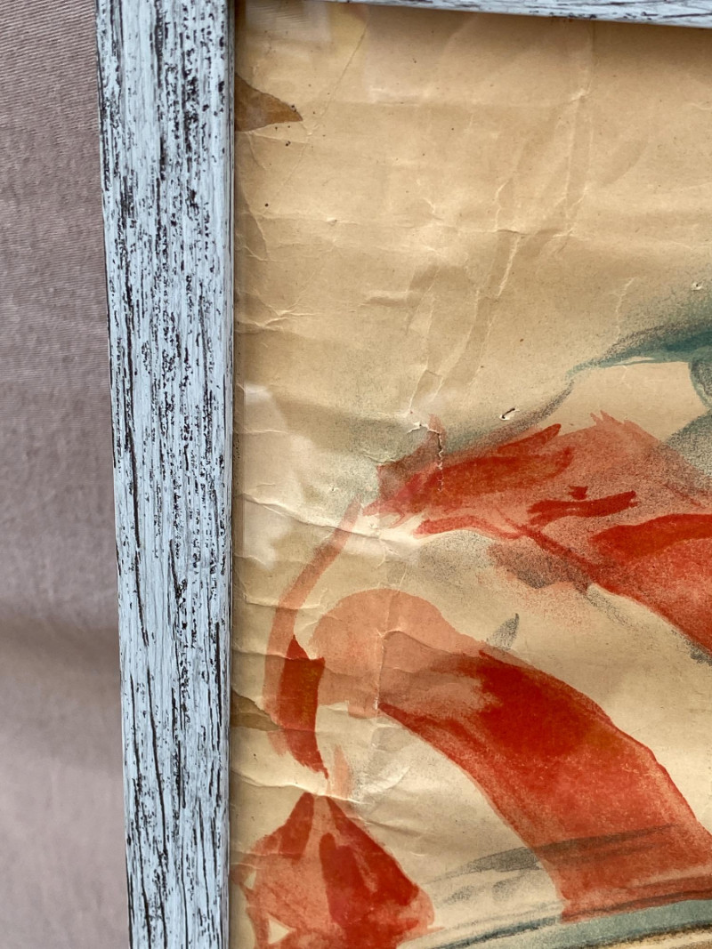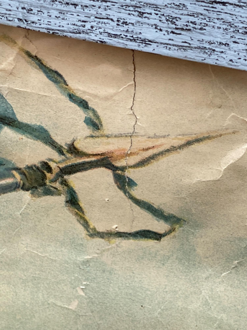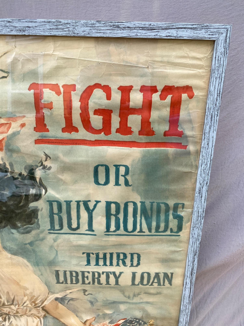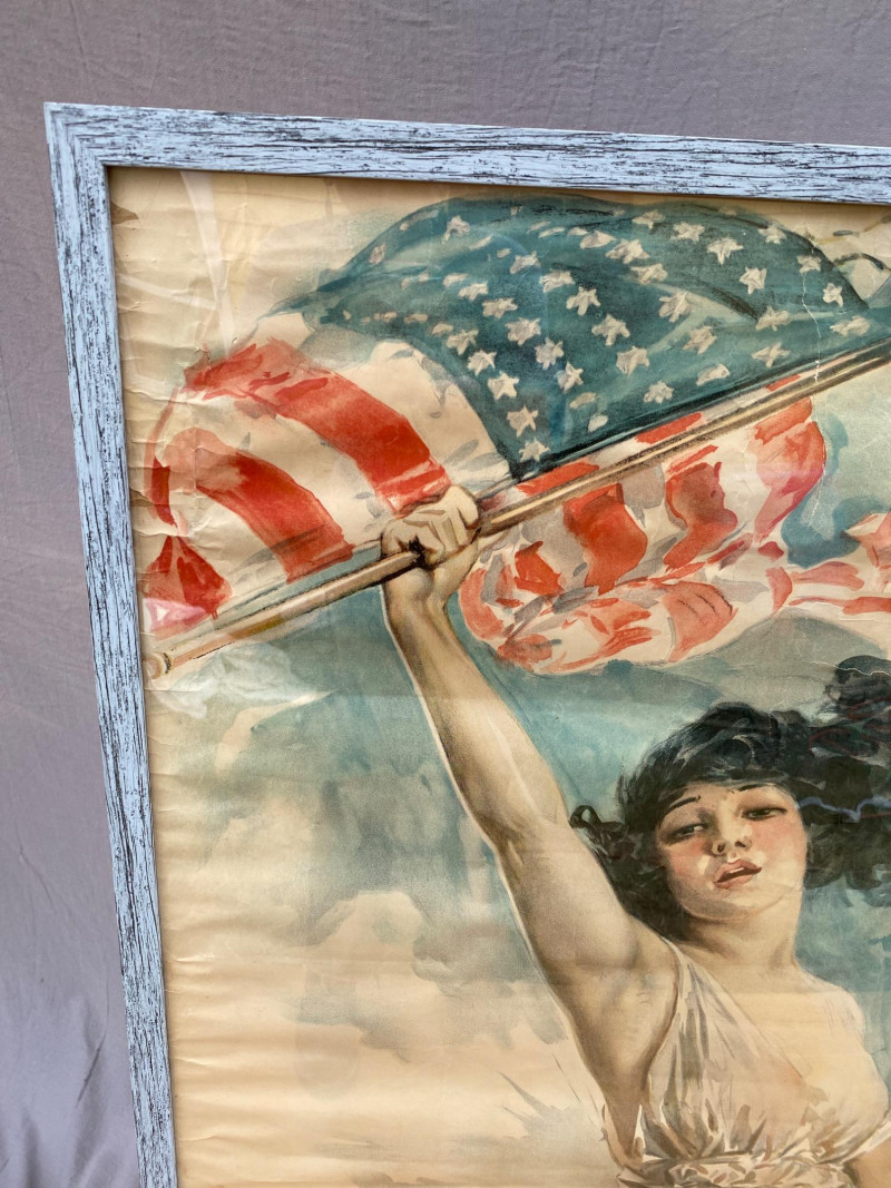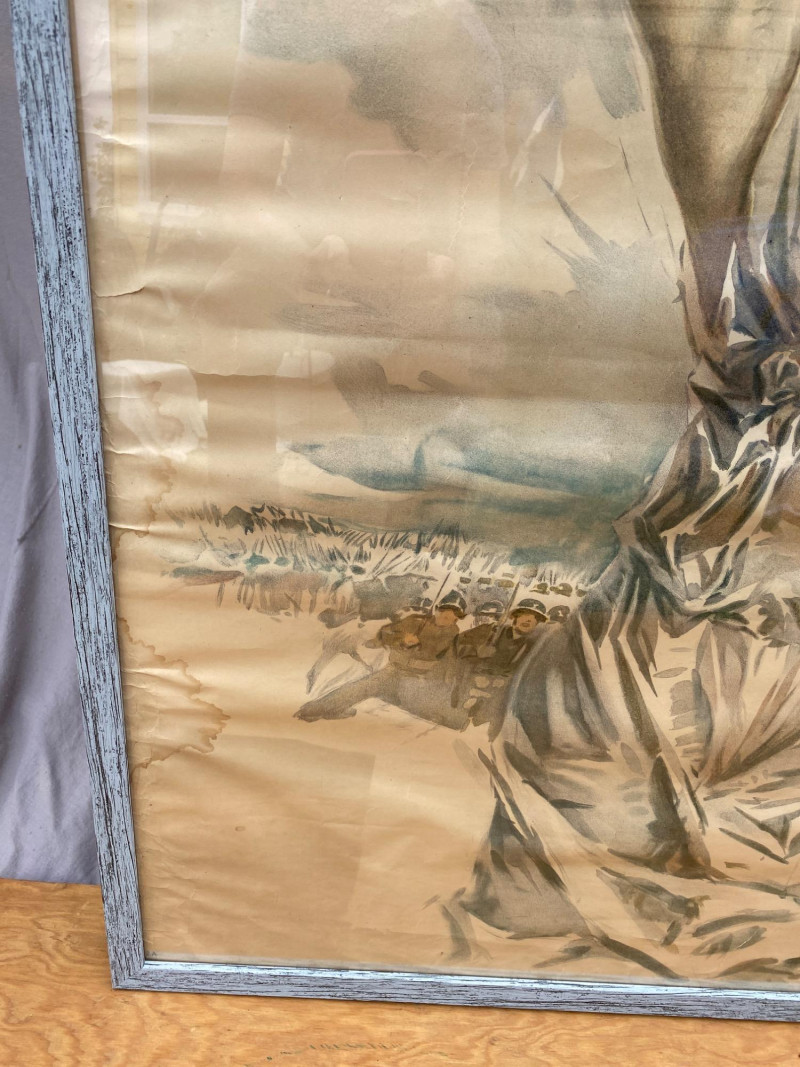 An original World War One poster dated 1917, illustrated by renowned artist Howard Chandler Christy. Despite some water damage on the lower left, along with tears and wrinkles, the colors remain bright and true, preserved by years of being rolled up. This is a powerful and visually stunning piece of wartime propaganda, ideal for collectors of military history, vintage ephemera, or early 20th-century illustration.