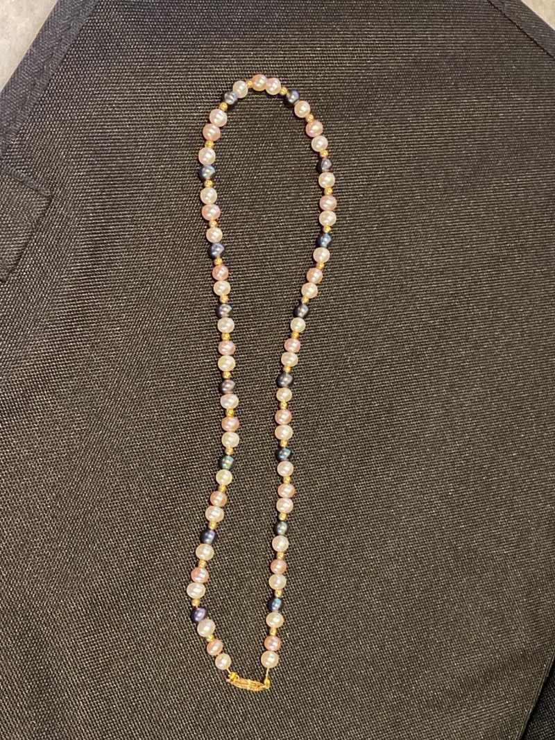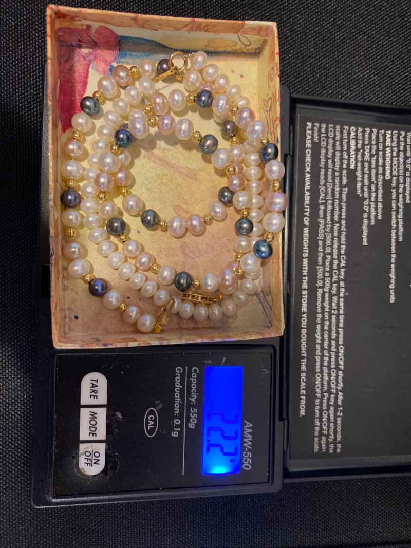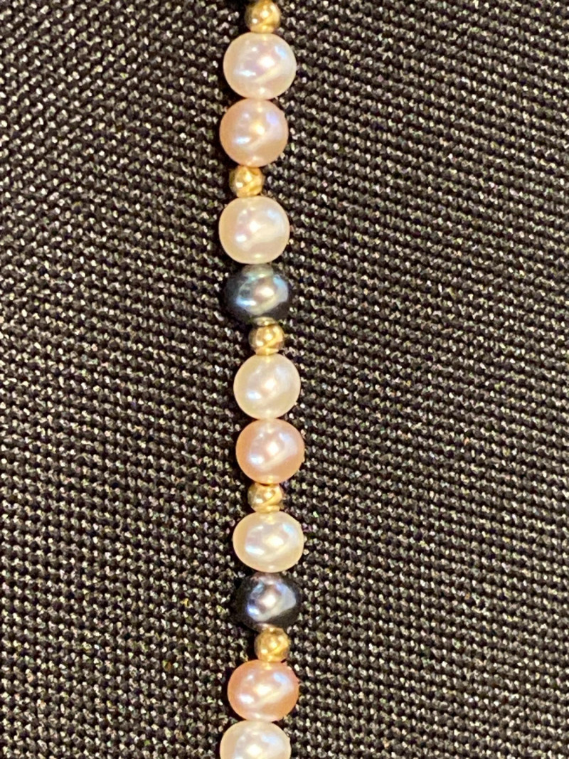 A lovely trio of fine jewelry featuring verified 10K and 14K gold components: Bracelet: 7½" long with a 10K gold clasp Necklace: 17½" long with a 14K gold clasp; features white, pale pink, and peacock pearls (gold content of spacer beads unverified) Pendant: 1" long golf bag charm marked 14K gold Note: Box lid is not included in weight. This lot offers a beautiful mix of elegance and value, ideal for collectors or gift-givers seeking authentic gold pieces.