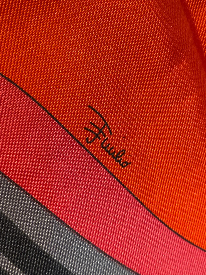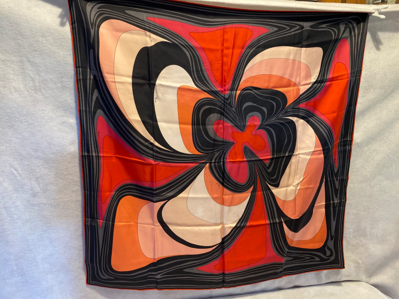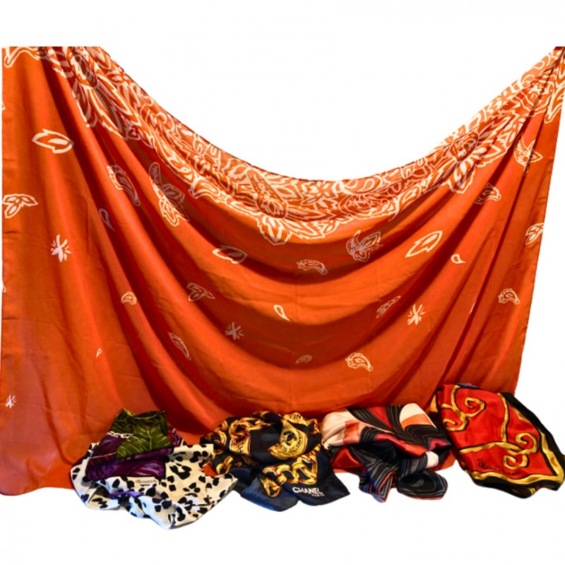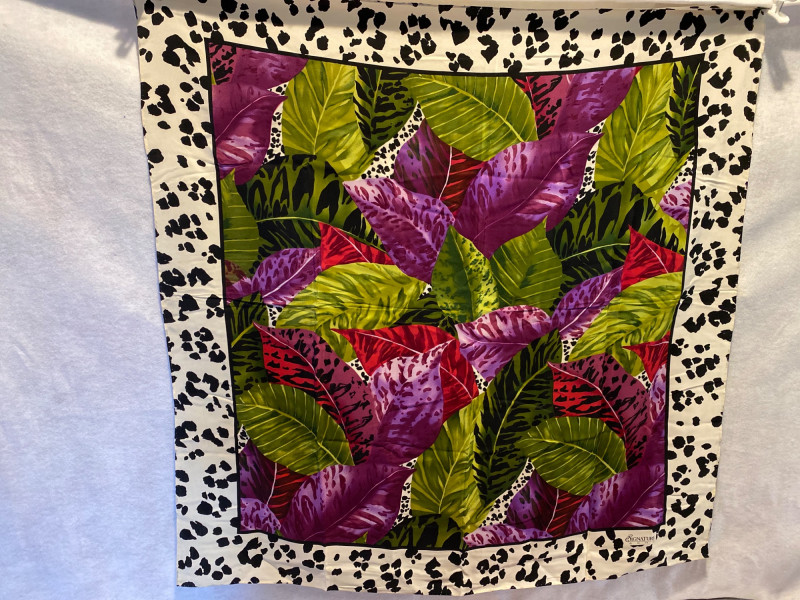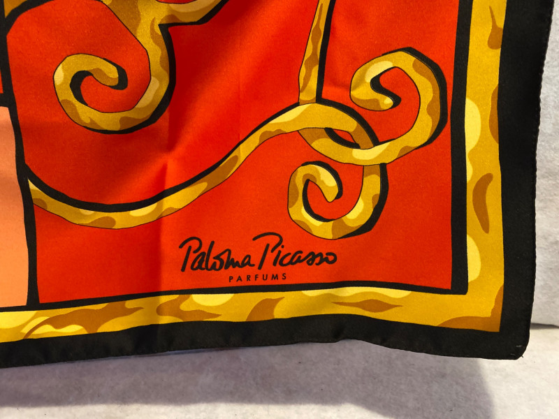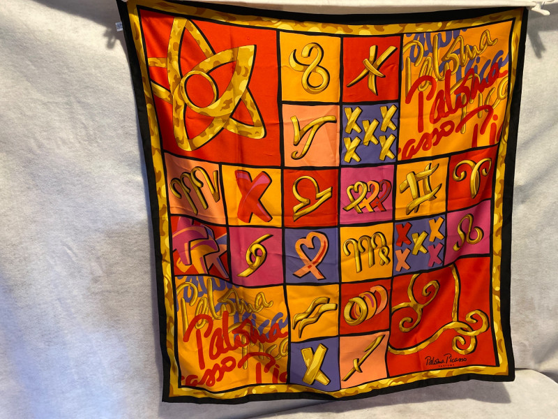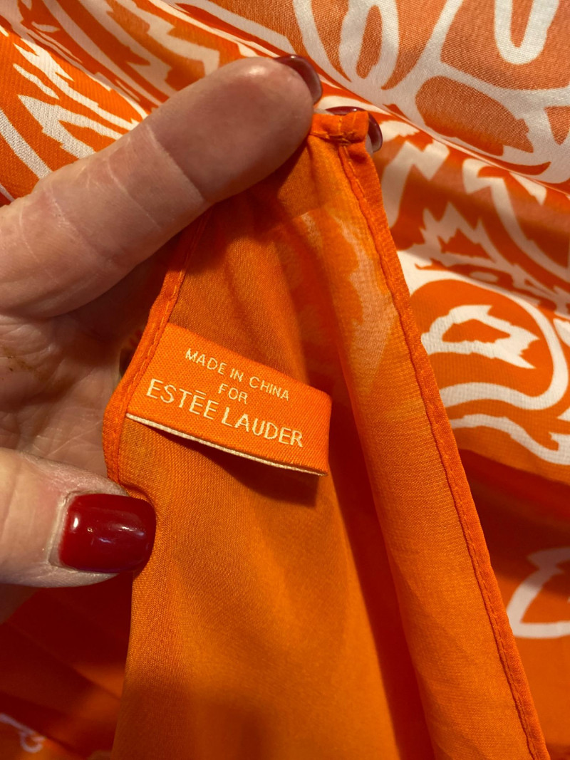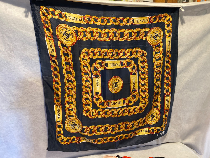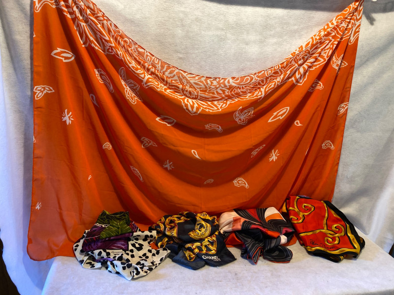 A luxurious lineup of designer scarves, each with its own flair: Estée Lauder: Bold orange, generously sized at 42" × 56" Echo: "Signature" - animal print edge, 33" × 33" Chanel: Classic elegance, 33" × 33" Fuilio: 33" × 33", with one small spot noted Paloma Picasso: Striking design, 34" × 34" Perfect for collectors, fashionistas, or anyone who believes a scarf should make a statement.