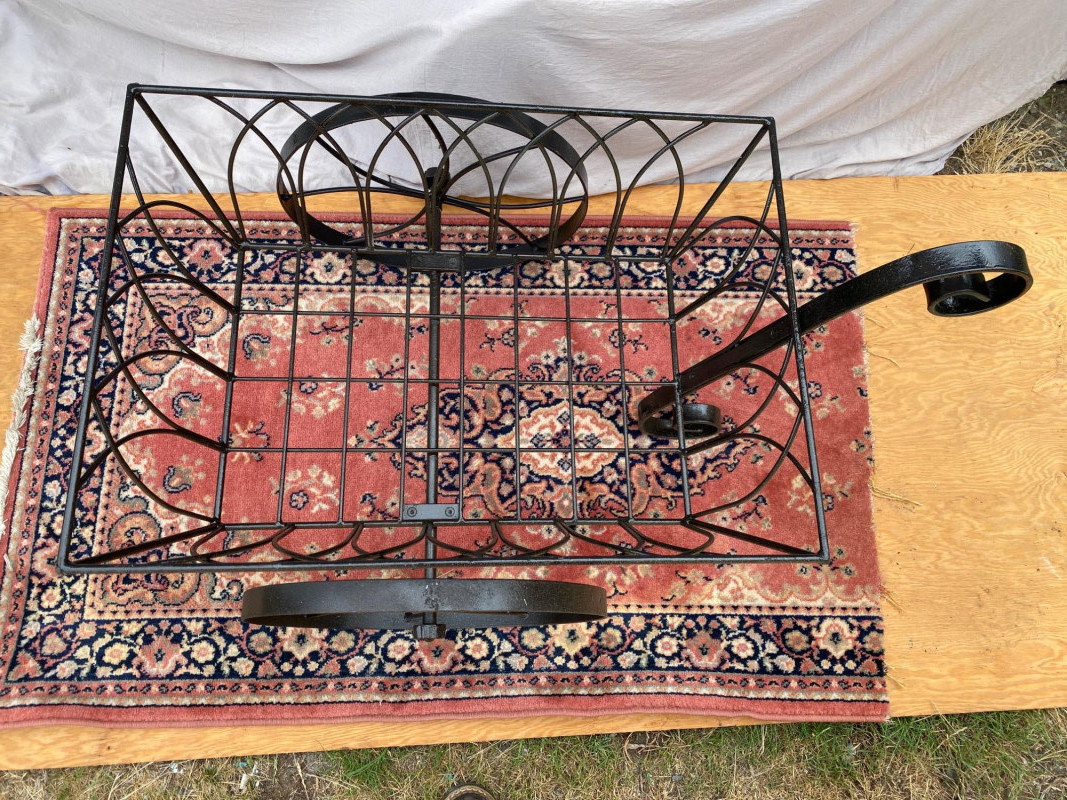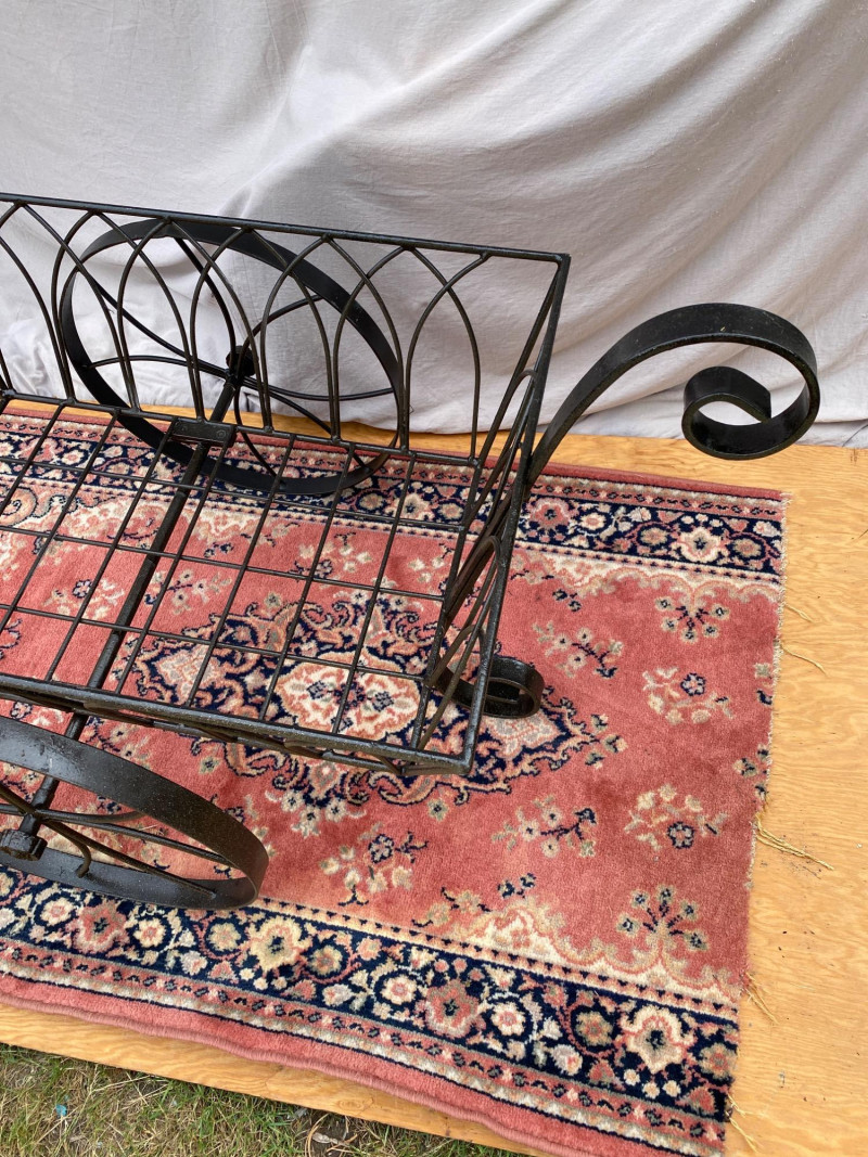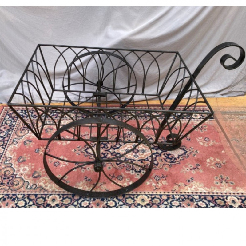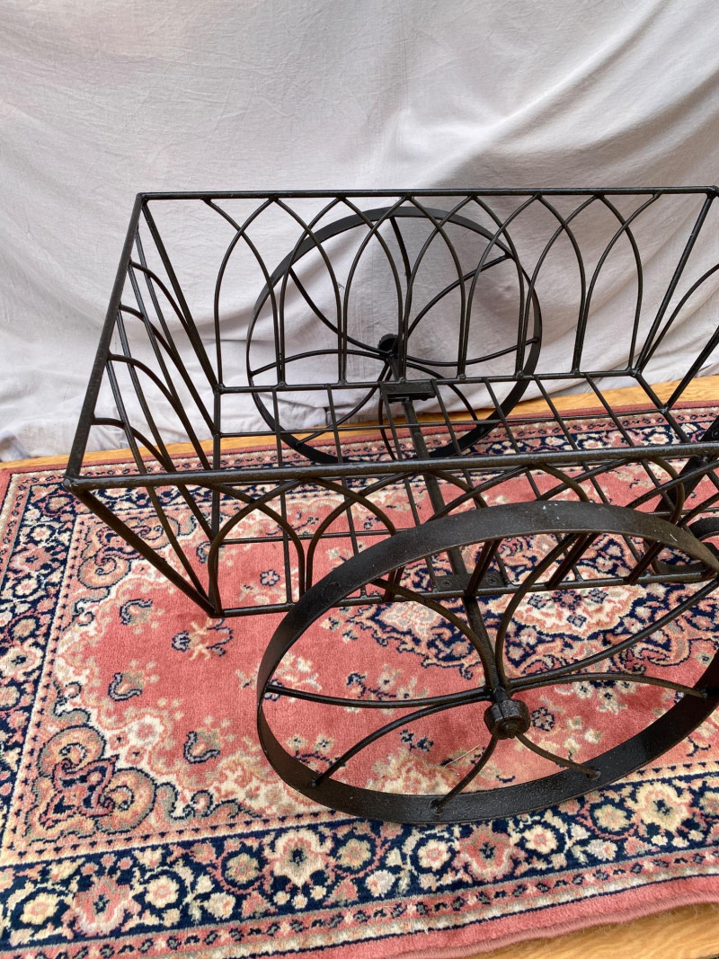 A decorative black wrought iron garden wheelbarrow, perfect for porch staging or cottage garden flair. The basket measures 27¾″ × 19¾″ and stands 27″ tall, while the wheels are 16½″ in diameter. Whether filled with seasonal blooms or left as a sculptural accent, this piece adds vintage charm and architectural interest to any outdoor space.