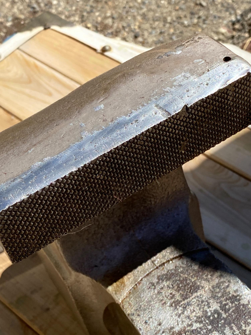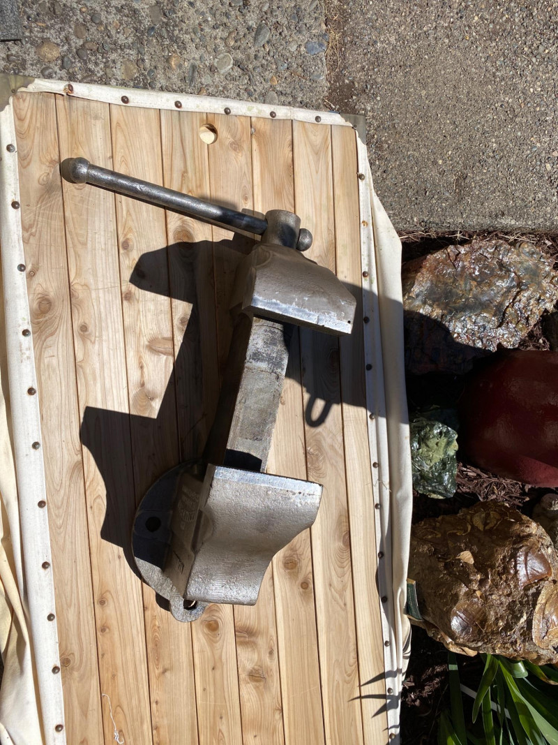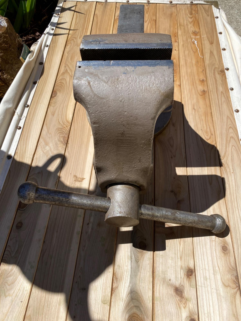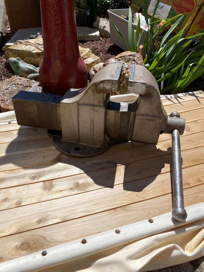 A rugged Colombian No. 505 bench vise featuring 5″ wide jaws and an opening capacity of over 7″. The face of the jaws remains in fine shape, making this a reliable tool for shop use or industrial display. Built for durability and grip, this vise is a testament to mid-century American manufacturing.