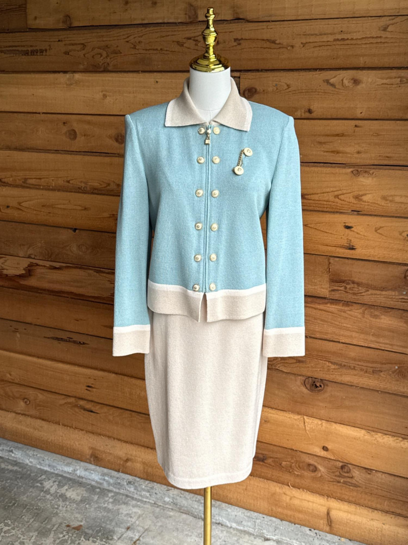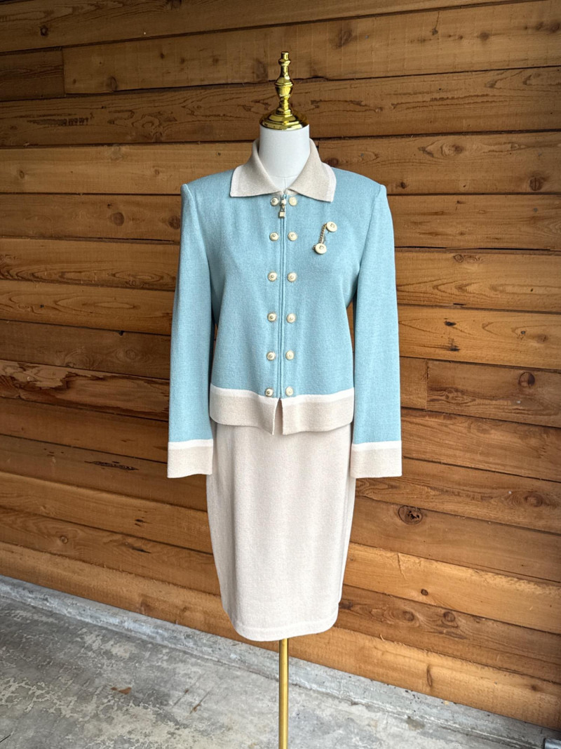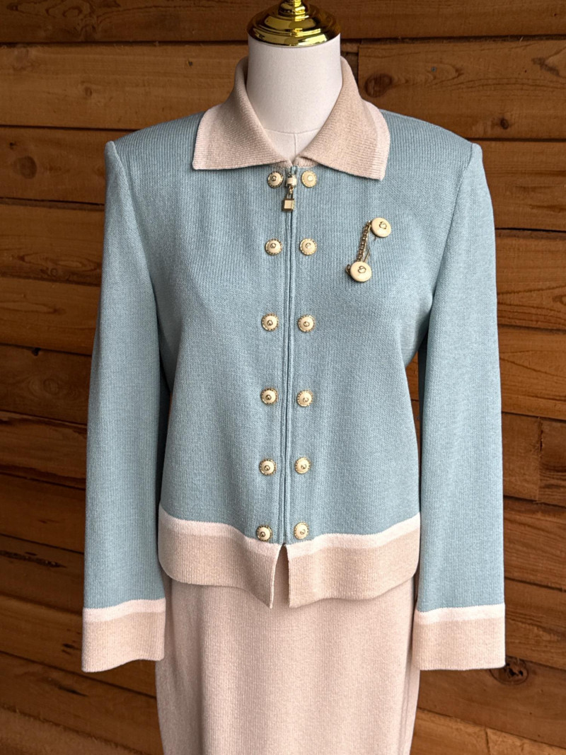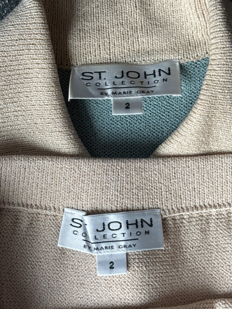ST JOHN Blue, Tan & Ivory Skirt Suit- Sz 2 PLEASE NOTE DIFFERENT PICKUP TIMES THAN TYPICAL FOR SOUND ESTATE AUCTIONS Pickups will be Wednesday, July 30th and Thursday, July 31st, Saturday, August 2nd from 4-6pm (firm by 6pm on Thursday) If you can not make these times, PLEASE ask for alternate available times or shipping. Shipping times will be up to 2 weeks after auction closes. Please call/text Jessica 253-350-0864 *All items will need to be collected by August 15th