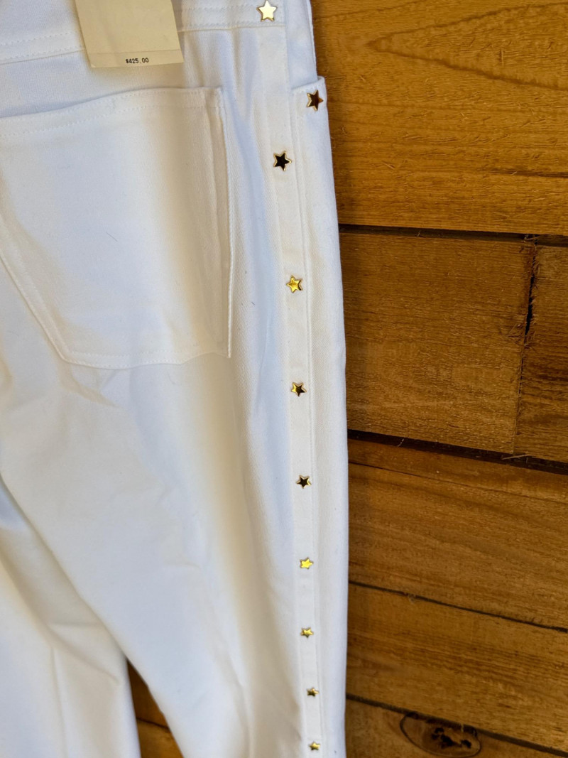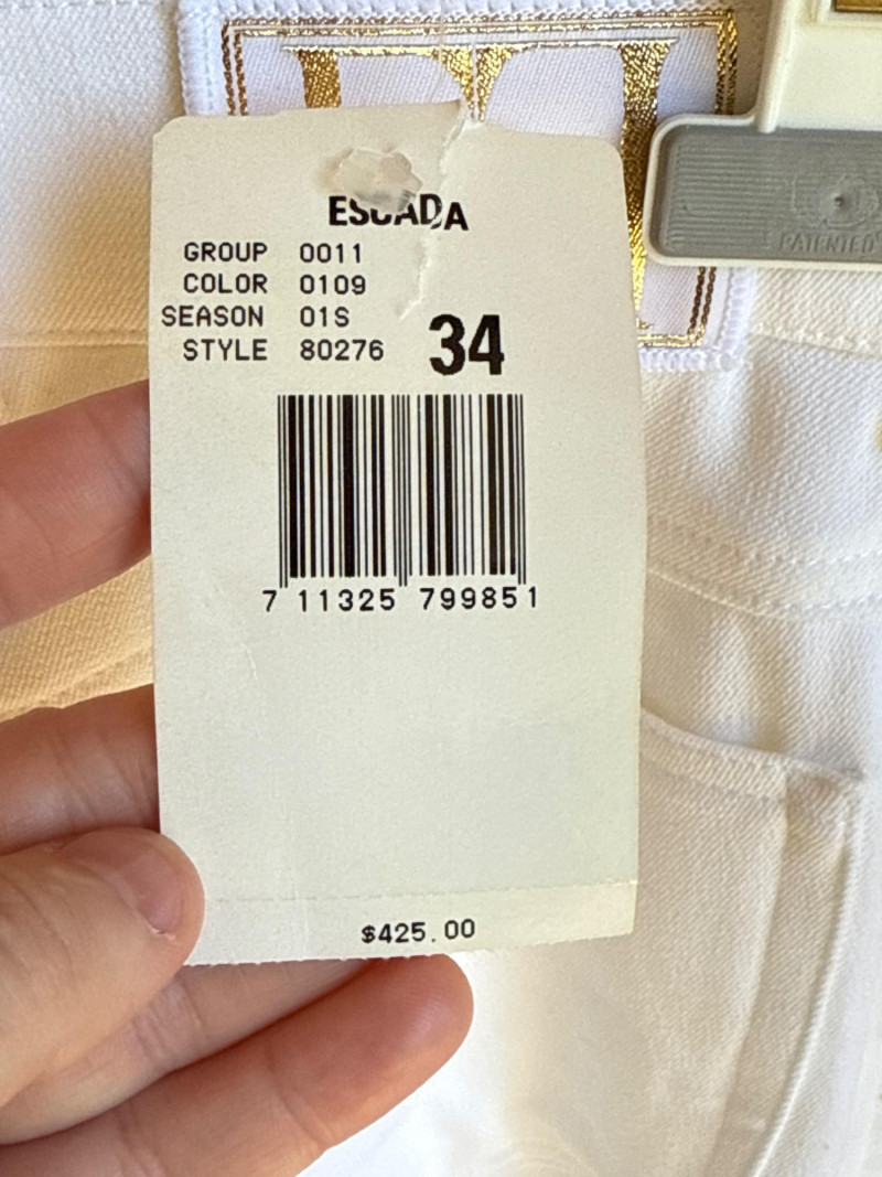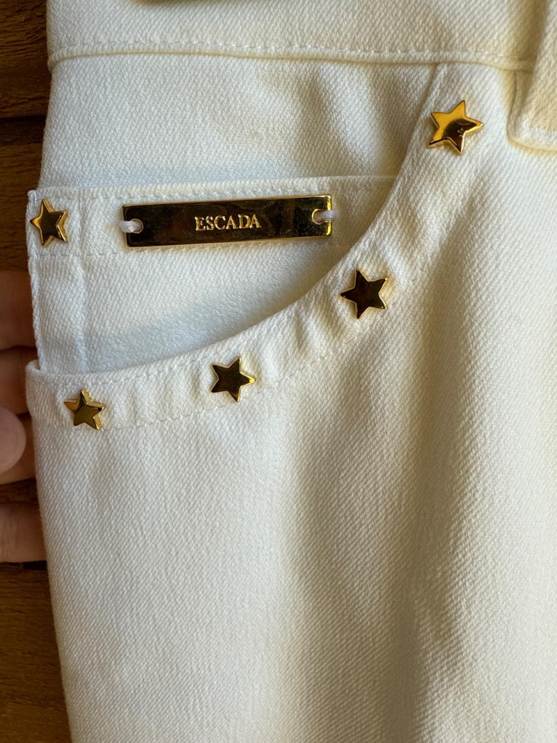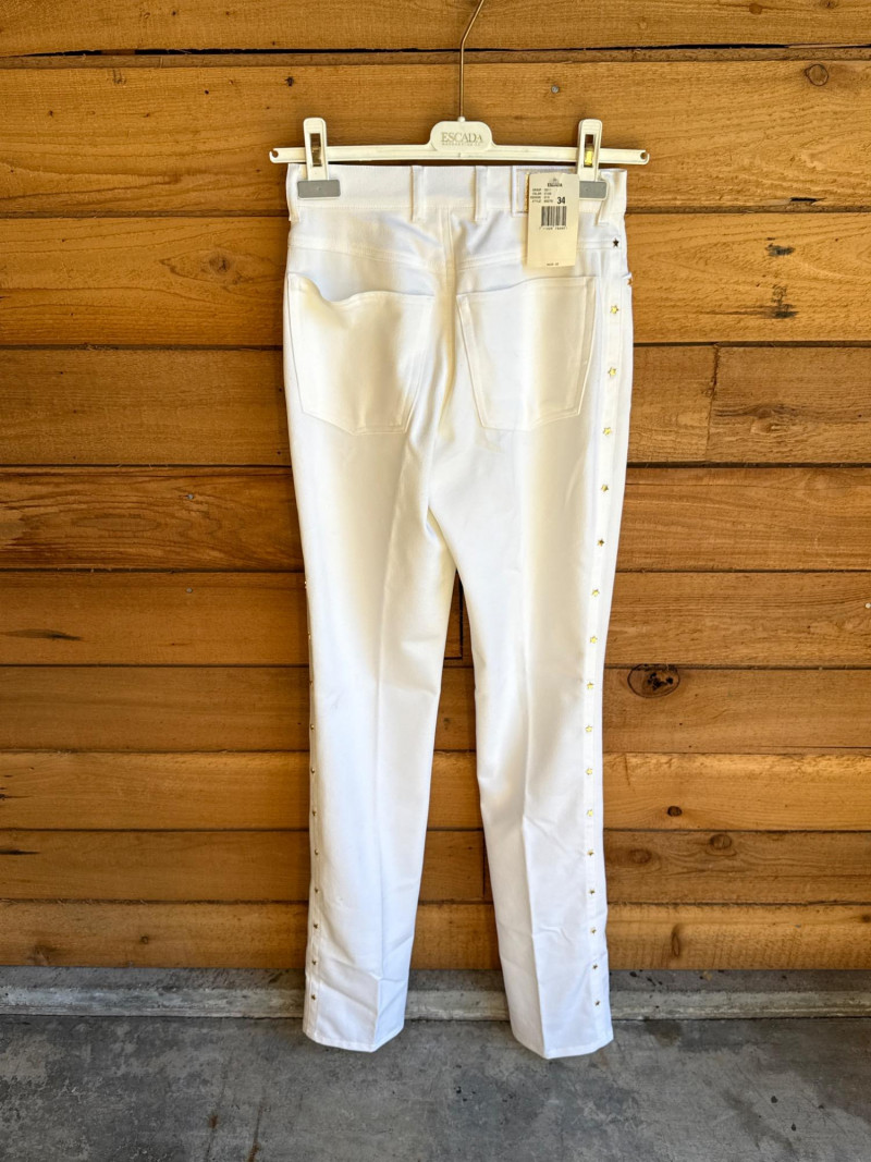 ESCADA White Stretch Denim Pants *NWT $425- Sz 34 White stretch denim with gold star hardware PLEASE NOTE DIFFERENT PICKUP TIMES THAN TYPICAL FOR SOUND ESTATE AUCTIONS Pickups will be Wednesday, July 30th and Thursday, July 31st, Saturday, August 2nd from 4-6pm (firm by 6pm on Thursday) If you can not make these times, PLEASE ask for alternate available times or shipping. Shipping times will be up to 2 weeks after auction closes. Please call/text Jessica 253-350-0864 *All items will need to be collected by August 15th