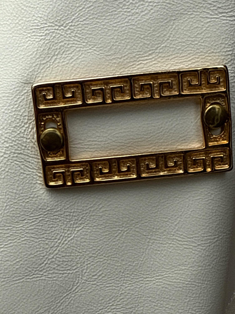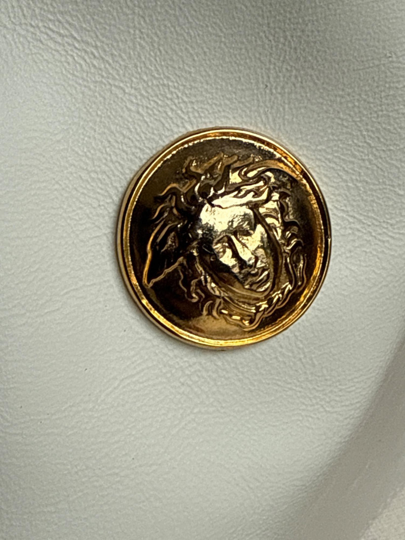 Vintage VERSACE(?) White Leather Vest w/ Gold No tag. But nice quality material, and appears to be the Versace Medusa Buttons along with the rest of the designs. PLEASE NOTE DIFFERENT PICKUP TIMES THAN TYPICAL FOR SOUND ESTATE AUCTIONS Pickups will be Wednesday, July 30th and Thursday, July 31st, Saturday, August 2nd from 4-6pm (firm by 6pm on Thursday) If you can not make these times, PLEASE ask for alternate available times or shipping. Shipping times will be up to 2 weeks after auction closes. Please call/text Jessica 253-350-0864 *All items will need to be collected by August 15th