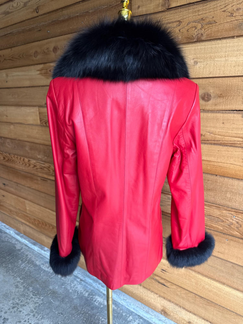 Lot # 118 - CHOSEN COUTURE Red Leather Jacket w/ Black Fox Fur Trim- Sz S
