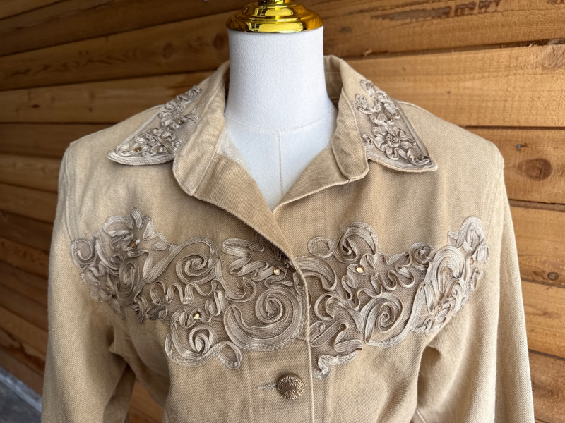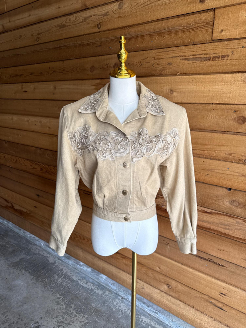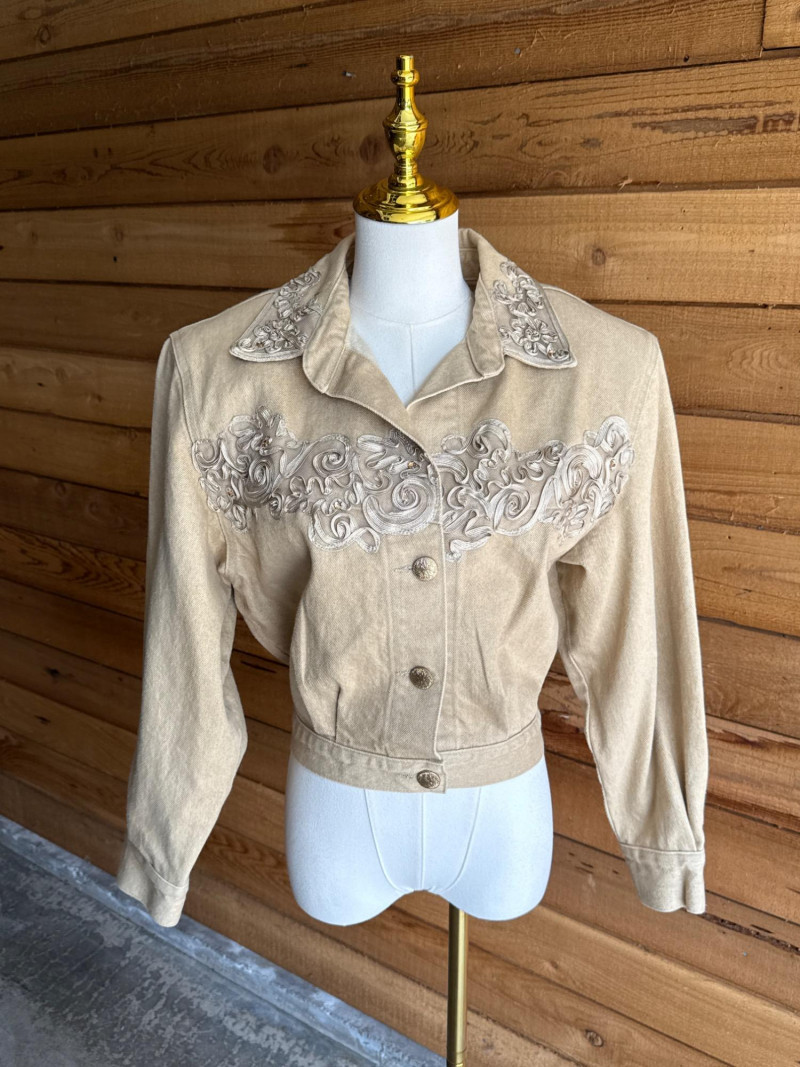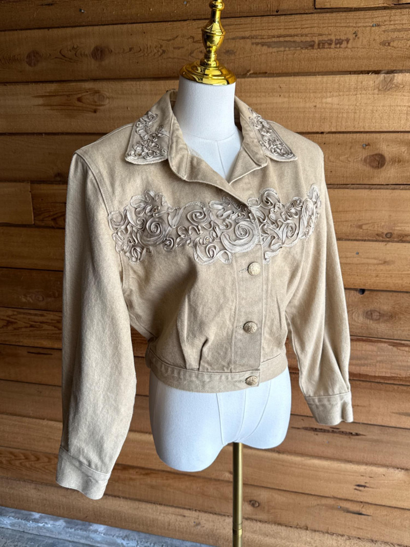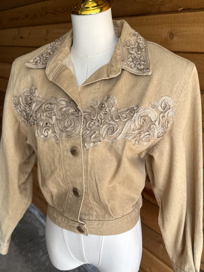 Lot # 120 - OPAL by Lorraine Wardy Tan Denim Cropped Jacket w/ Beading- Sz S
