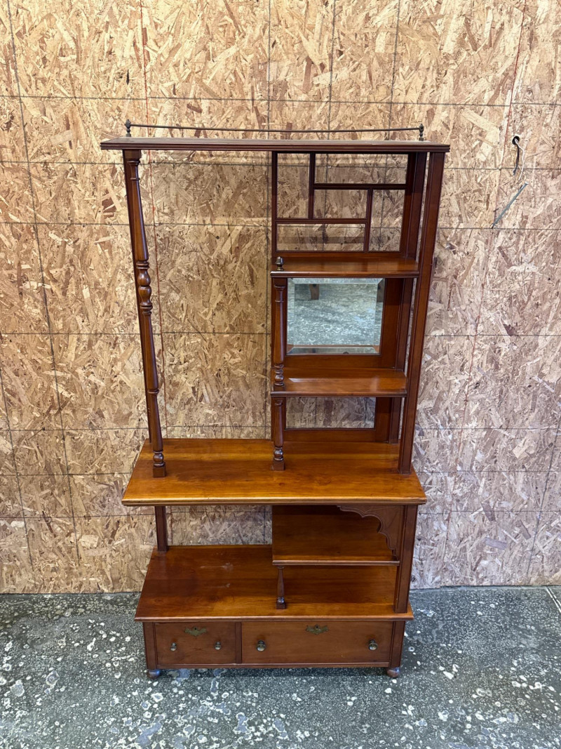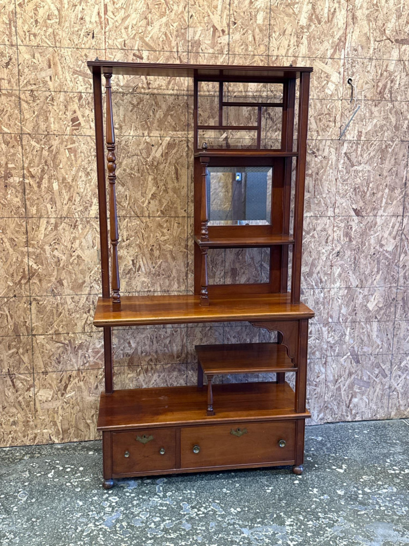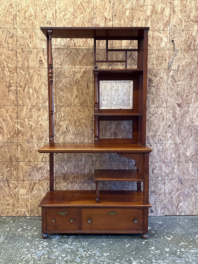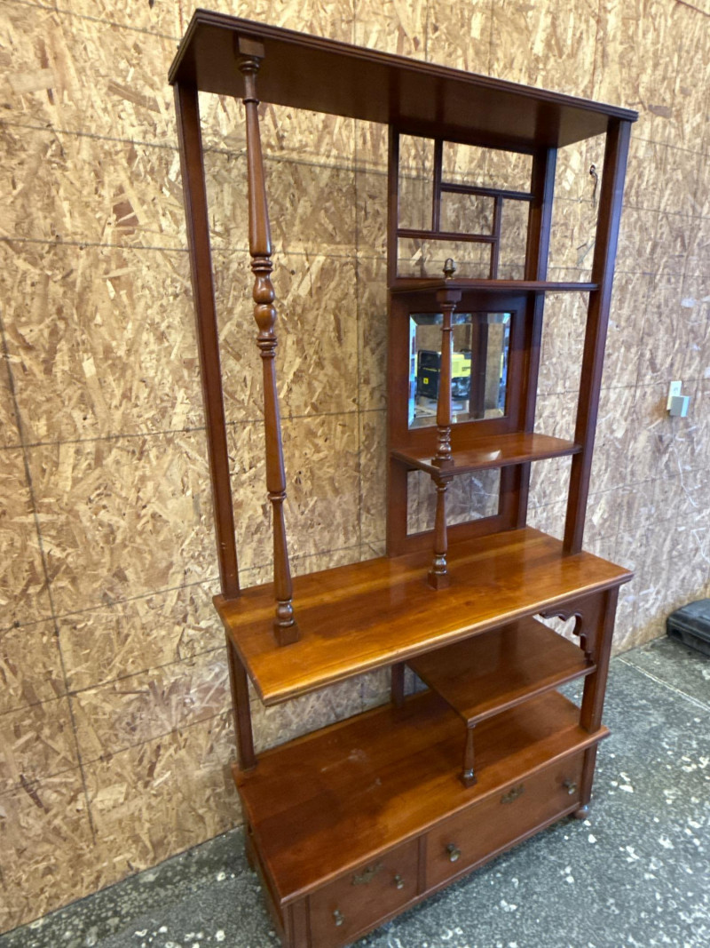 Vintage Knickknack Shelf w/ Drawers & Mirror. Has a couple spots that may need polishing or leave as is. Top of bookshelf has a little metal railing detail. along with a little beveled mirror and two bottom drawers. Please see photos for more details. Vintage condition.