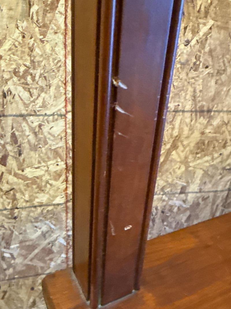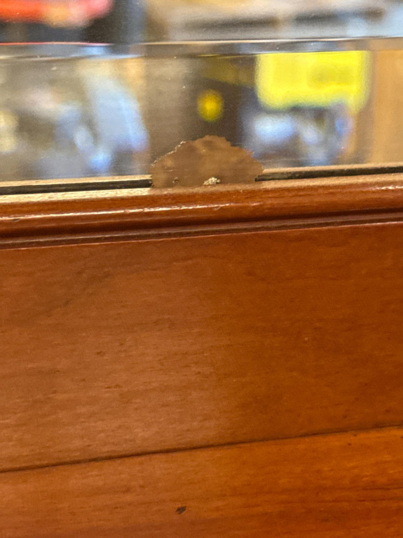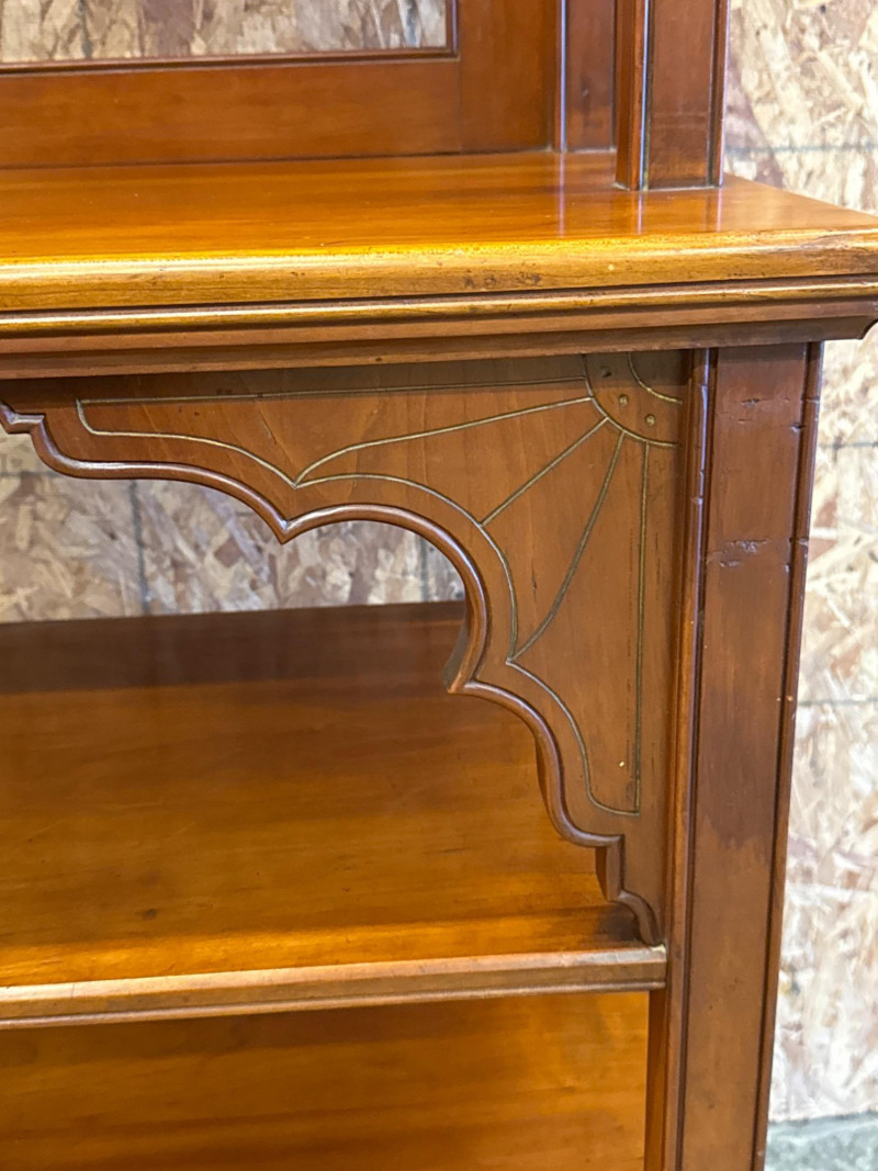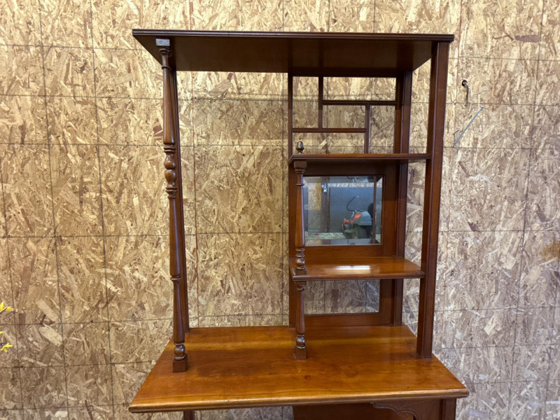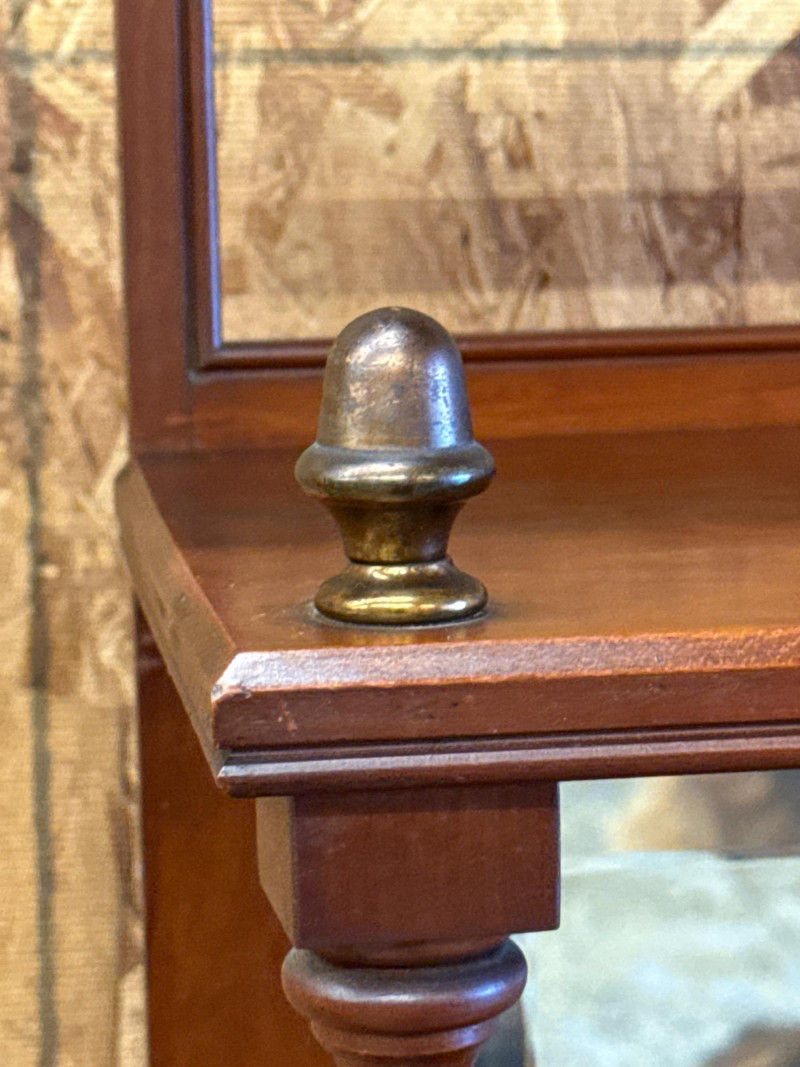 Vintage Knickknack Shelf w/ Drawers & Mirror. Has a couple spots that may need polishing or leave as is. Top of bookshelf has a little metal railing detail. along with a little beveled mirror and two bottom drawers. Please see photos for more details. Vintage condition.