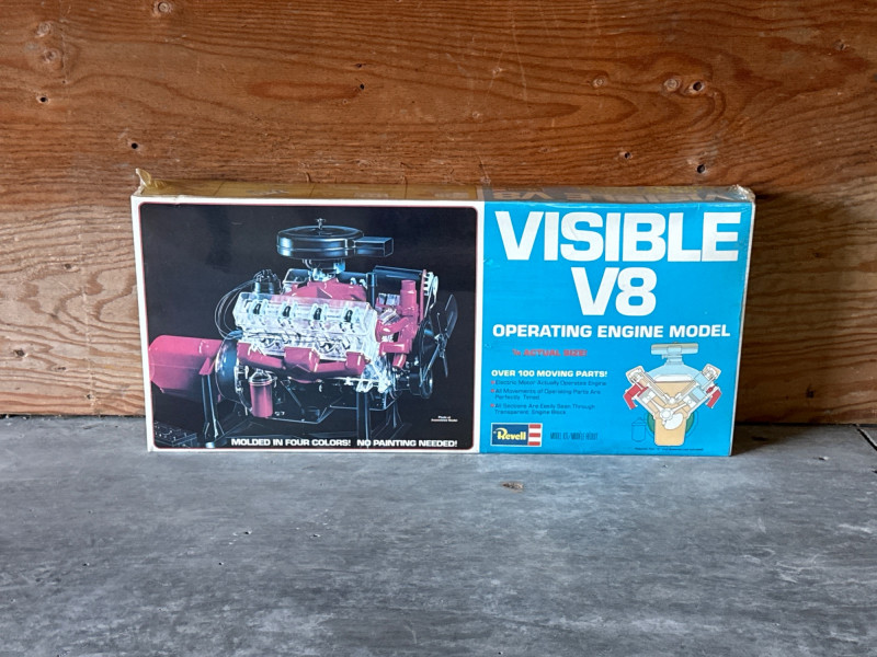 Revell Visible V8 1:4 Model Operating Engine Model Kit Over 100 moving parts! Still in original box w/ plastic protectant wrapping. 1. Electric motor actually 2. All movements of operating parts are perfectly timed 3. All sections are easily seen through transparent engine block