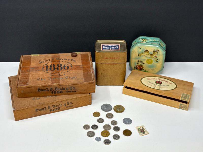 Foreign Coins, Tokens, Antique Tin & Cigar Boxes