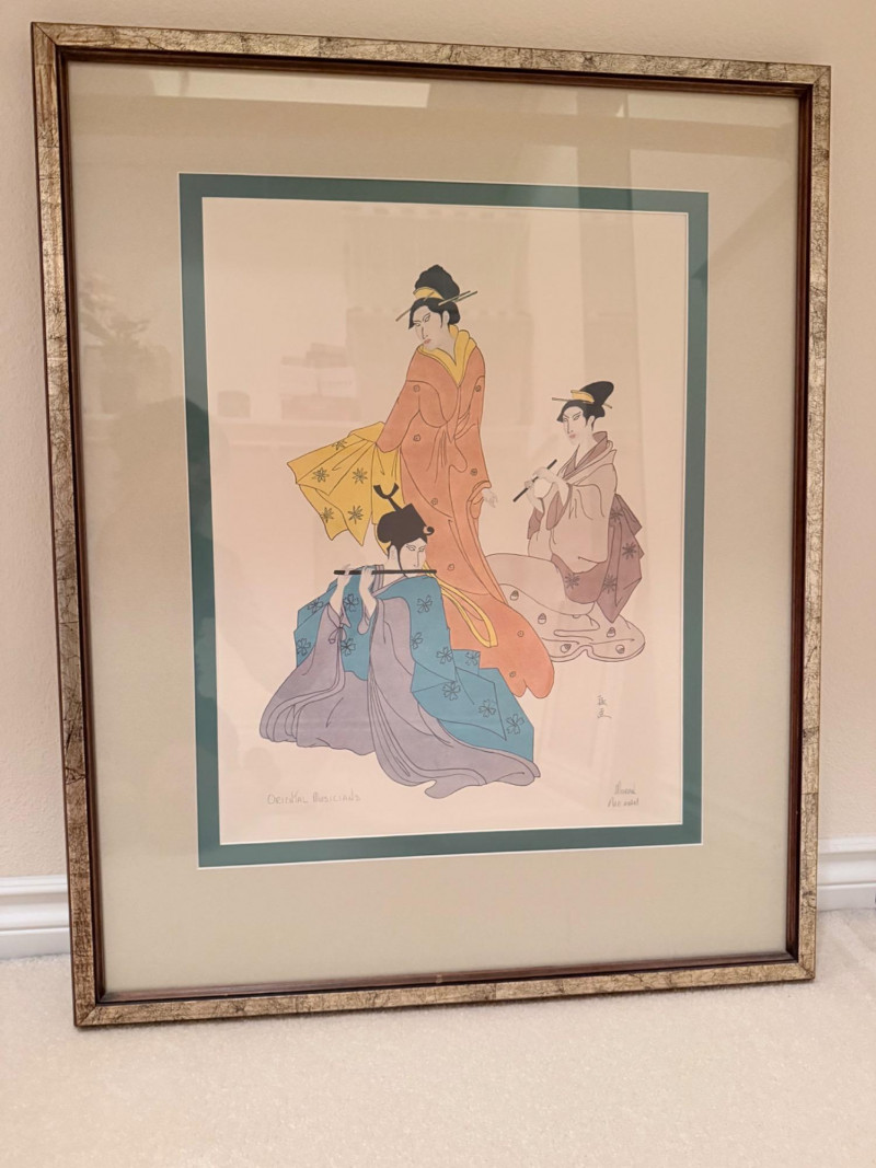 Oriental Musicians –Signed Pat Moran Watercolor and Pencil Drawing Two watercolor and pencil works on paper depicting traditional Japanese musicians in formal dress. One figure holds a flute, while the other appears in mid-performance. The images are rendered with flowing lines and filled color washes, framed under glass in a textured metallic frame. Both are signed in pencil, one marked “Moran” and the other inscribed in Japanese characters. The label reads “Oriental Musicians.” Artist: Pat Moran