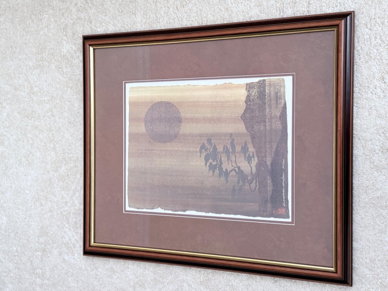 Framed Limited Edition Print by Nicholas Kirsten Honshin A signed and numbered limited edition print by Nicholas Kirsten Honshin, numbered 95/500. The image features a composition with a mountainous horizon, silhouetted tree forms, and a full circular element above, arranged on a vertically textured field. The artist’s signature and edition number appear beneath traditional seals. The piece is matted and framed under glass with a double mat in coordinated tones and a wood frame with gold inner trim. Nicholas Kirsten Honshin is a Seattle-based artist whose work draws from Christian, Zen, and Tibetan Buddhist symbols, as well as shamanic traditions. His art often reflects themes of meditation, nature, and spiritual unity, aiming to convey moments of peace and reflection. Dimensions: