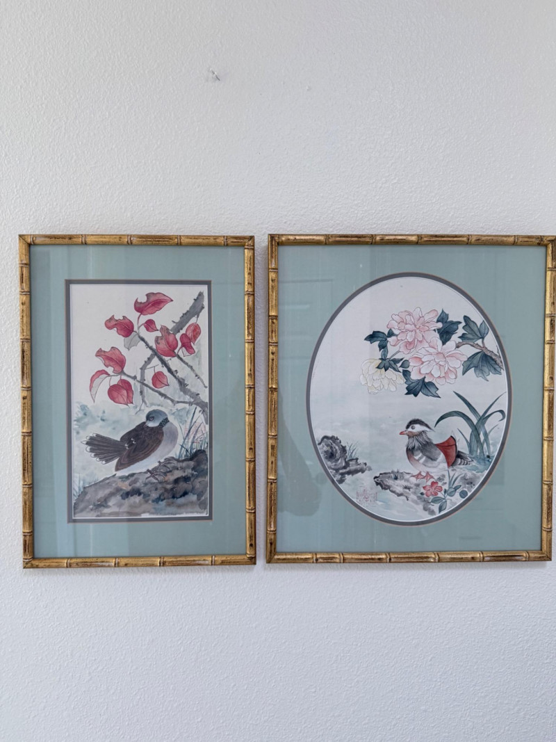 Pair of Framed Chinese Bird and Flower Watercolor Paintings A pair of watercolor paintings featuring birds perched among flowering branches and natural rock formations. One piece presents a circular composition with two birds beneath blooming peonies, while the other features a vertical format with a single bird beside twisting foliage and leaves. Both works include calligraphic seals. The paintings are framed under glass with bamboo-style gilt frames and light green mats, one with an oval window and the other with a rectangular opening. Dimensions: