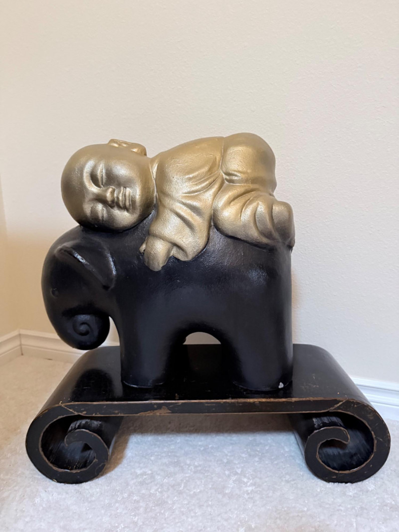 Shaolin Monk on Elephant Sculpture with Wooden Base A sculptural piece showing a reclining monk figure on the back of a stylized elephant. The figure rests with eyes closed and one arm draped forward. The elephant form features a curled trunk and arched legs. Both are finished in contrasting tones. The sculpture is mounted on a separate wooden stand with curled ends and surface wear along the edges. Dimensions: