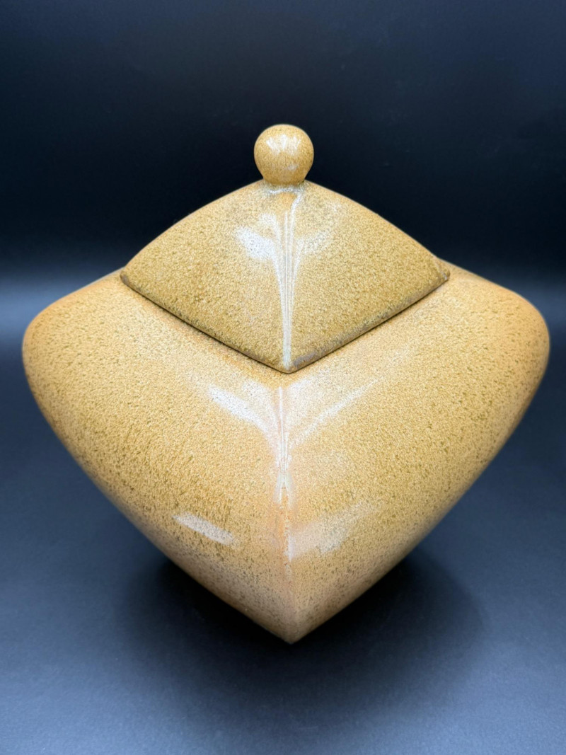 Oriental Accent Speckled Ceramic Lidded Jar Ceramic lidded jar with a wide, tapering body and a square, stepped lid topped by a rounded finial. The surface is coated in a speckled glaze. The base is fitted with corner pads and bears a label from “Oriental Accent – Since 1880,” a producer of East Asian-style decorative objects. Dimensions: