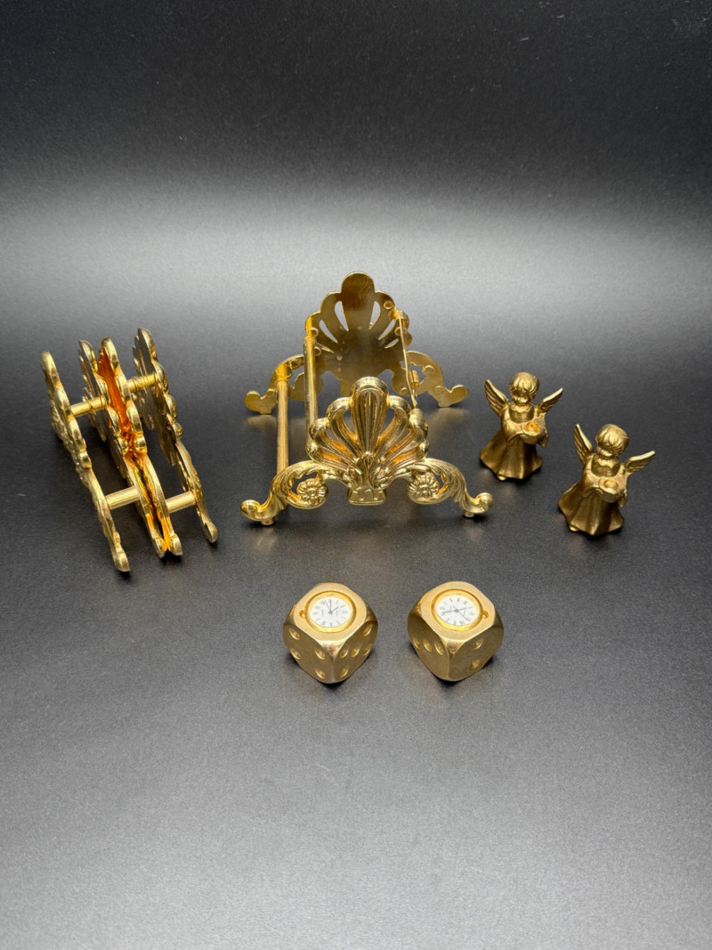 Assortment of Gold-Tone Brass Tabletop Pieces Group of small gold-tone metal tabletop pieces. Includes a napkin holder and knife rest rack with shell and scroll motifs in the Hollywood Regency style, a pair of angel candlestick holders, and two dice-shaped quartz clocks marked “Chess.” Includes: Hollywood Regency style napkin holder Hollywood Regency style knife rest rack Pair of angel candlestick holders Two dice-shaped quartz clocks marked “Chess” Size Range: