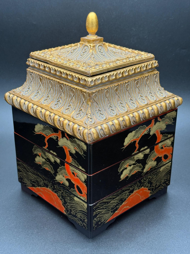 Japanese Lacquered Jubako Box with Temple Roof Lid Tiered Japanese jubako box composed of three stacking compartments and a removable lid shaped in the form of a traditional temple roof. The surface is decorated with pine trees, waves, and a red mountain motif, rendered in gold and vermilion against a black lacquered ground. The compartments are lined in red. The piece is marked “Made in Japan” on the base. Dimensions: