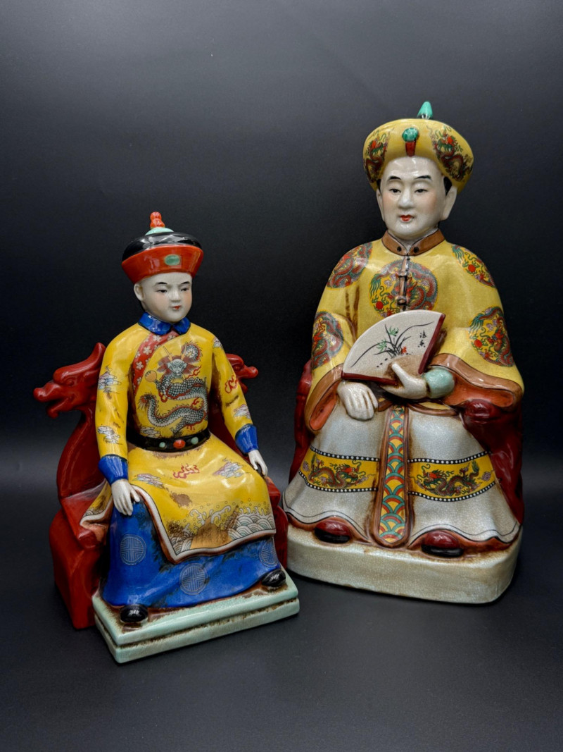 Vintage Chinese Emperor and Prince Porcelain Figures A pair of vintage Chinese porcelain figures representing an emperor and a prince. Both are seated on red thrones with molded detailing. The emperor holds a folding fan and wears a robe with floral and geometric patterns, a sash, and a rounded headdress with raised ornaments. The prince is dressed in a robe decorated with a dragon, with hands resting on the knees and a flat headdress with a top finial. Each figure has a long braided hairstyle and painted facial features. The undersides are unglazed and fitted with protective pads. Dimensions: