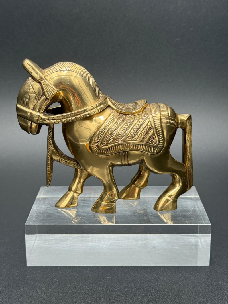 Brass Horse Sculpture on Clear Base Figurine depicting a bridled horse standing with head slightly lowered and tail hanging straight. The surface is detailed with a patterned saddle and tack, featuring repeated geometric designs on both sides. The horse stands on a rectangular clear block base. Material: Possibly brass