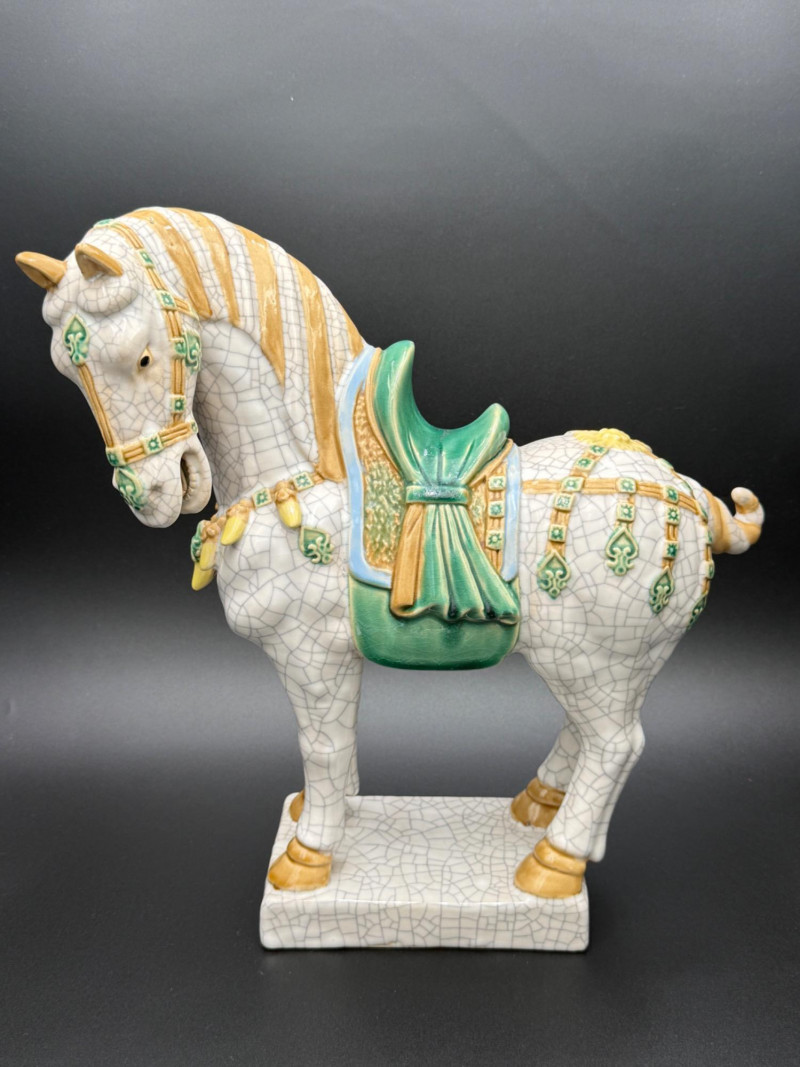 Porcelain Horse Sculpture with Crackle Glaze, 16" Tall Figure of a horse standing with all four hooves on a rectangular base. The surface displays a crackle glaze throughout. The mane is ridged and falls along one side of the neck, and the tail is curled and bound. The horse is fitted with a saddle and cloth drapery in green and gold tones, along with a harness adorned with rosettes and suspended pendants. The head is lowered slightly and equipped with a bridle, reins, and collar featuring ornamental elements. Sticker label marked “Made in China” on the underside. Dimensions (approx.): 16 x 15 x 6 inches