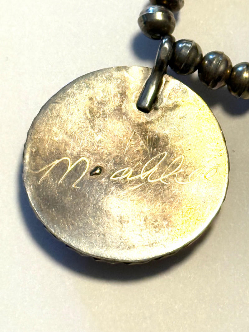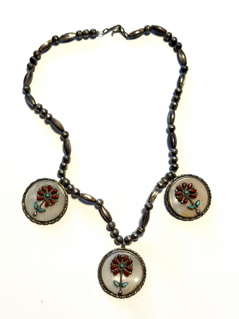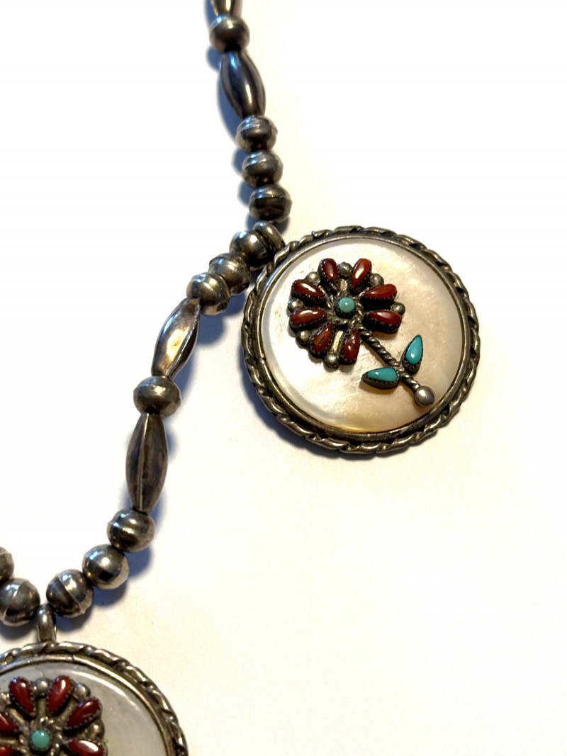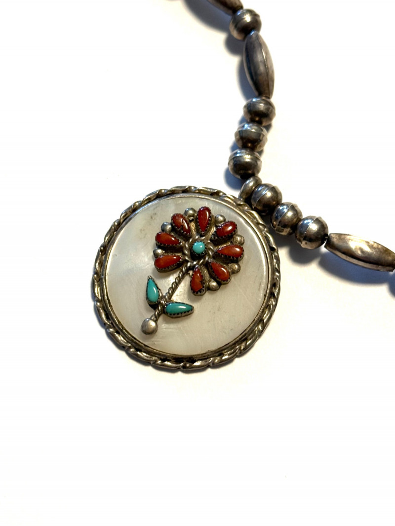 Lot # 17 - Mahkee Zuni Sterling, Turquoise, Coral and Shell Necklace