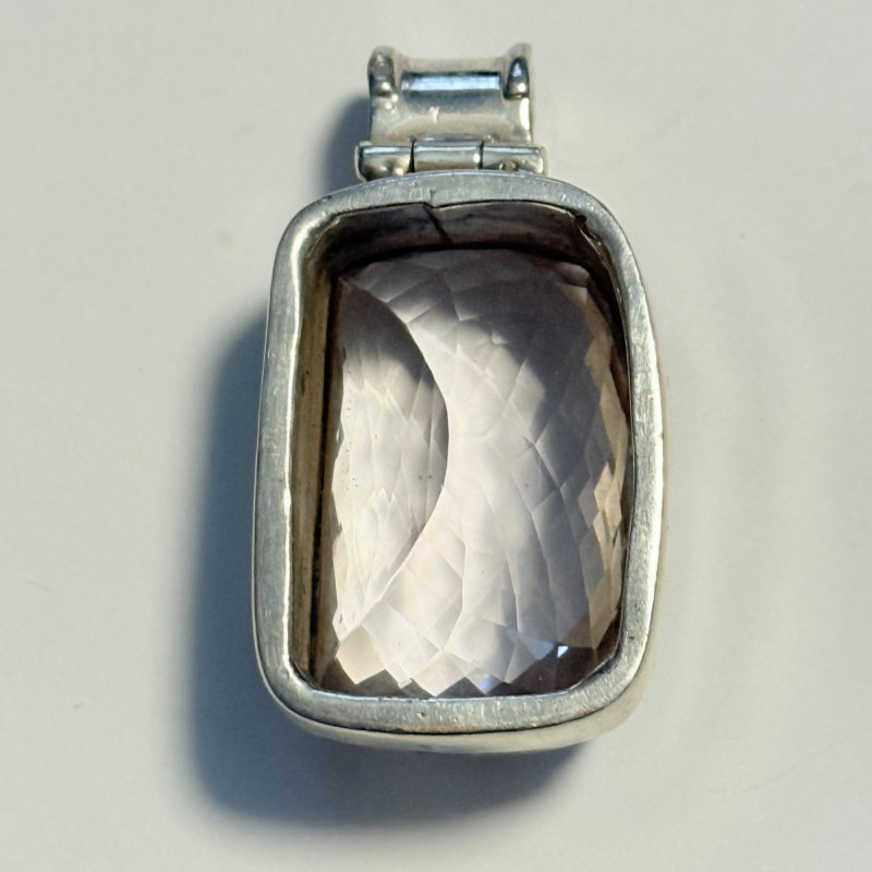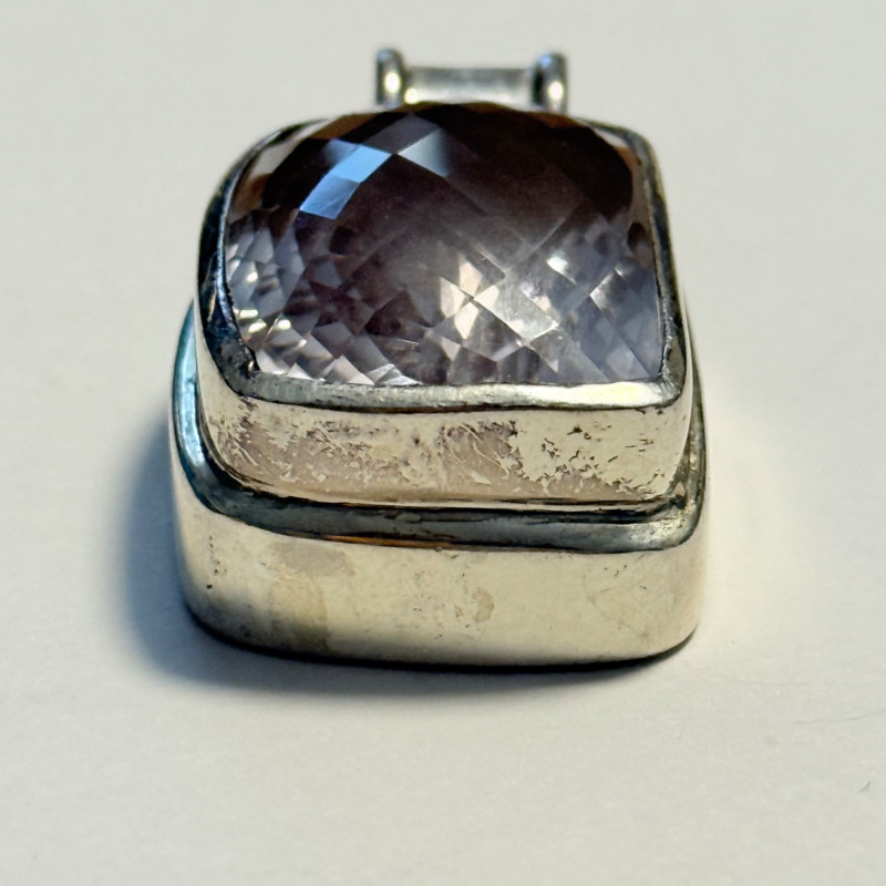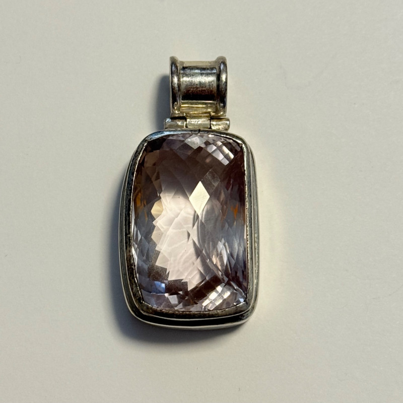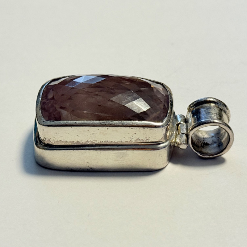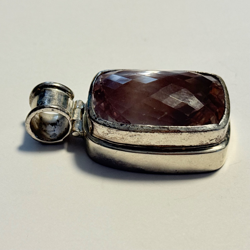 Pendent measures 1 inch wide by one and a half inches tall by 3/4 inch deep. Stamped 925 gemstone has light pink hue to it.
