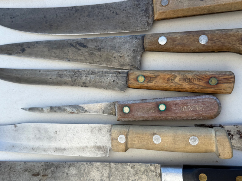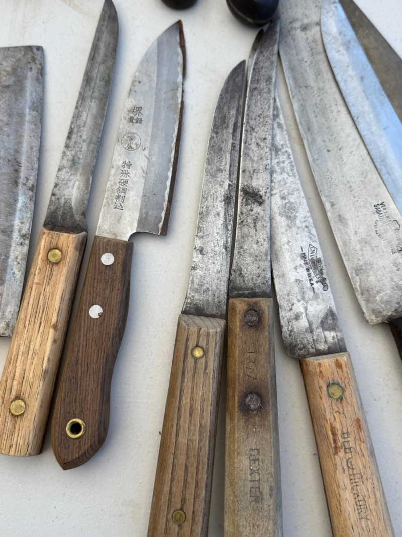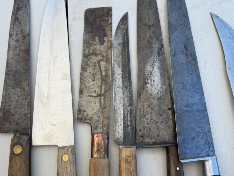 Large assortment of kitchen knives.