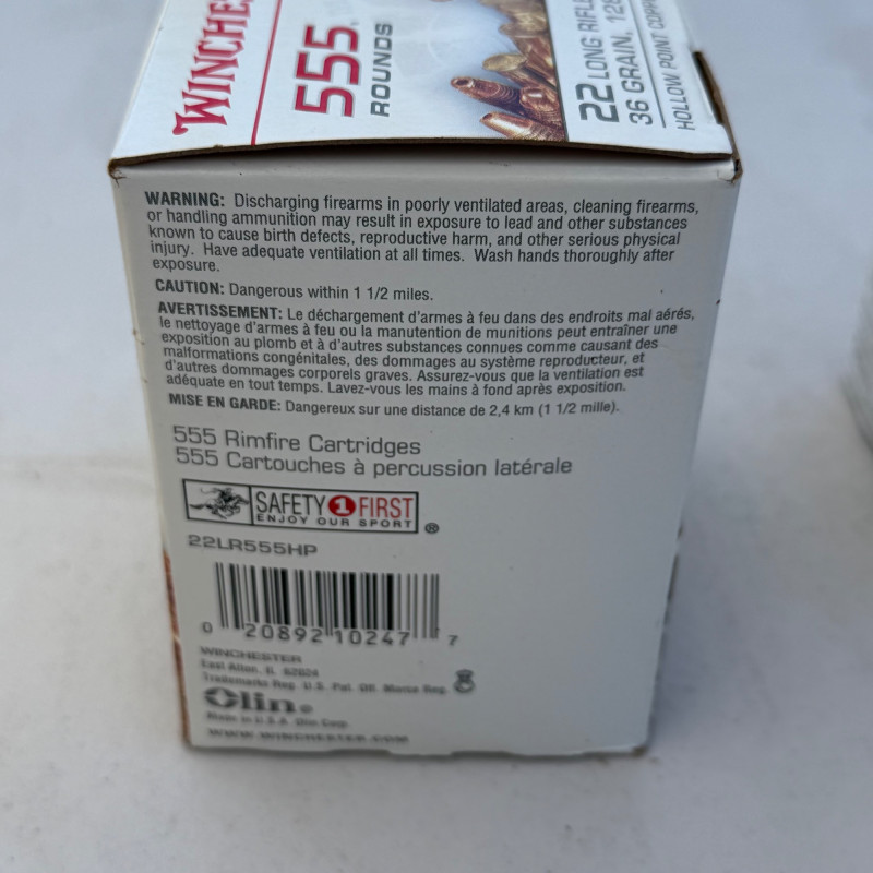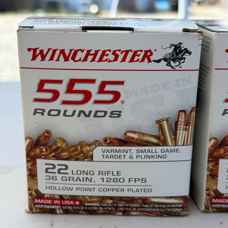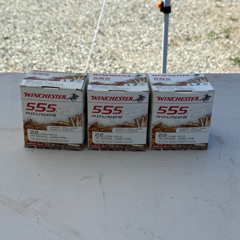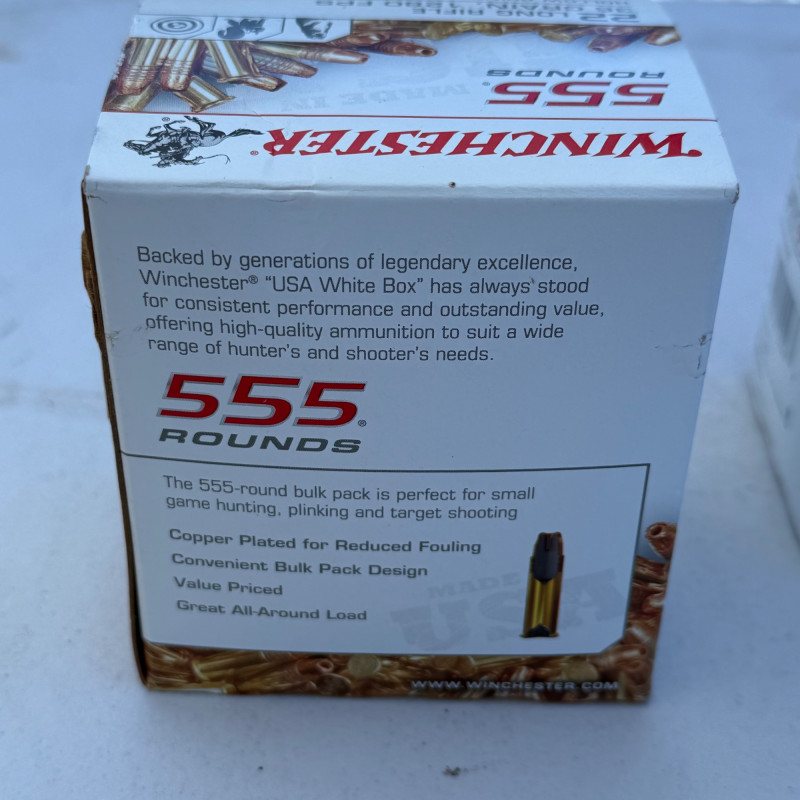 Available are three sealed boxes of Winchester .22 Long Rifle ammunition, offering a combined total of 555 rounds. Renowned for consistent performance and accuracy, Winchester .22 LR remains a popular choice for recreational shooting, plinking, and small game hunting.