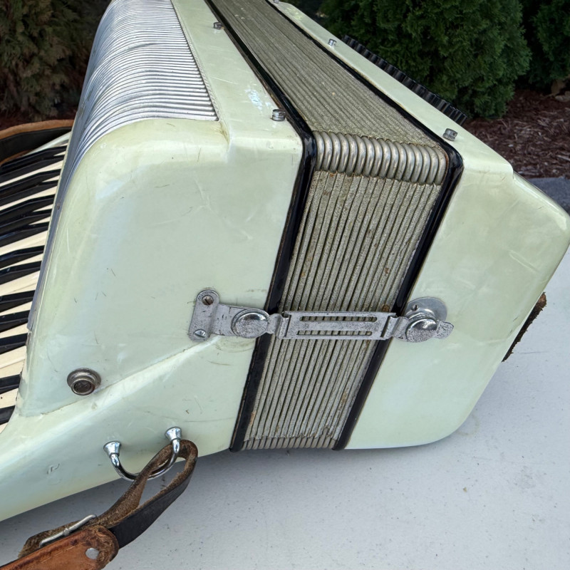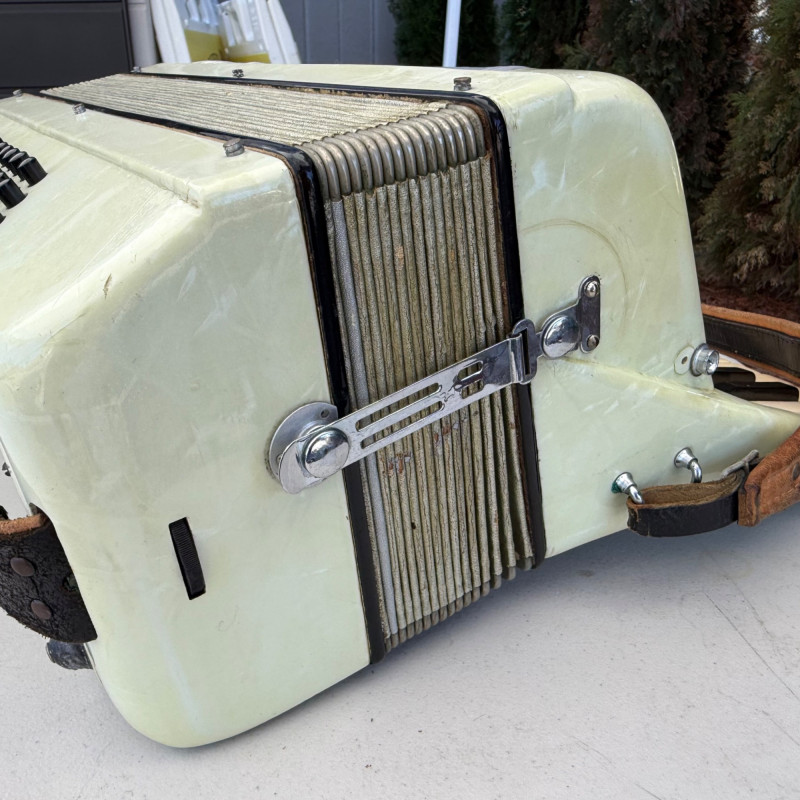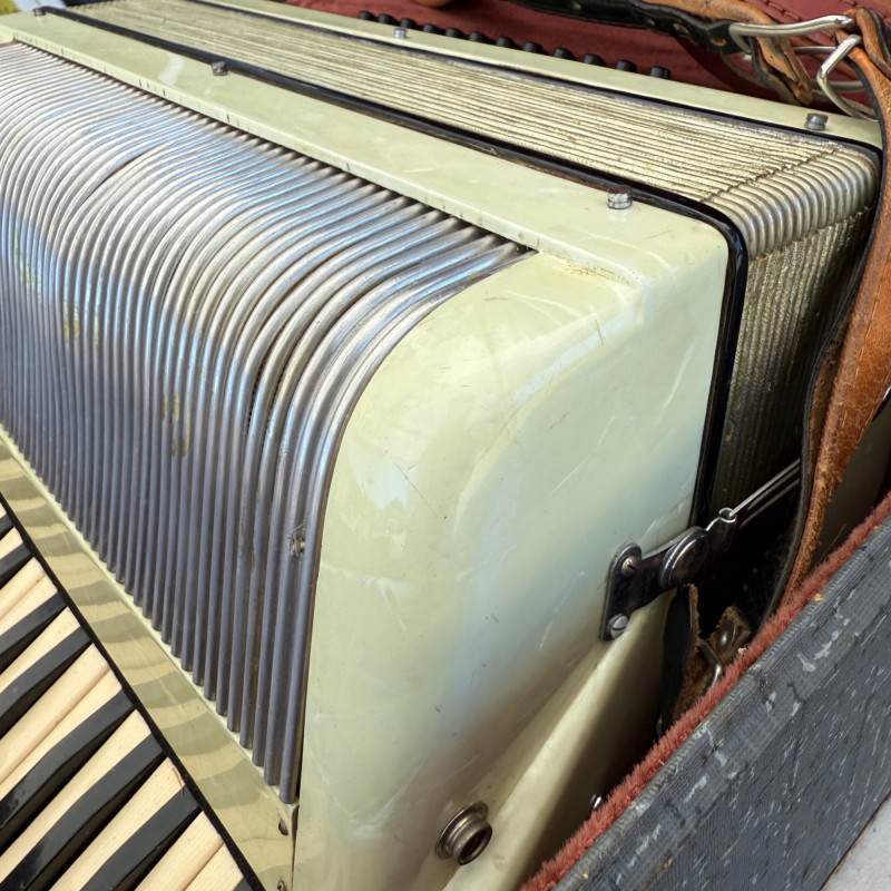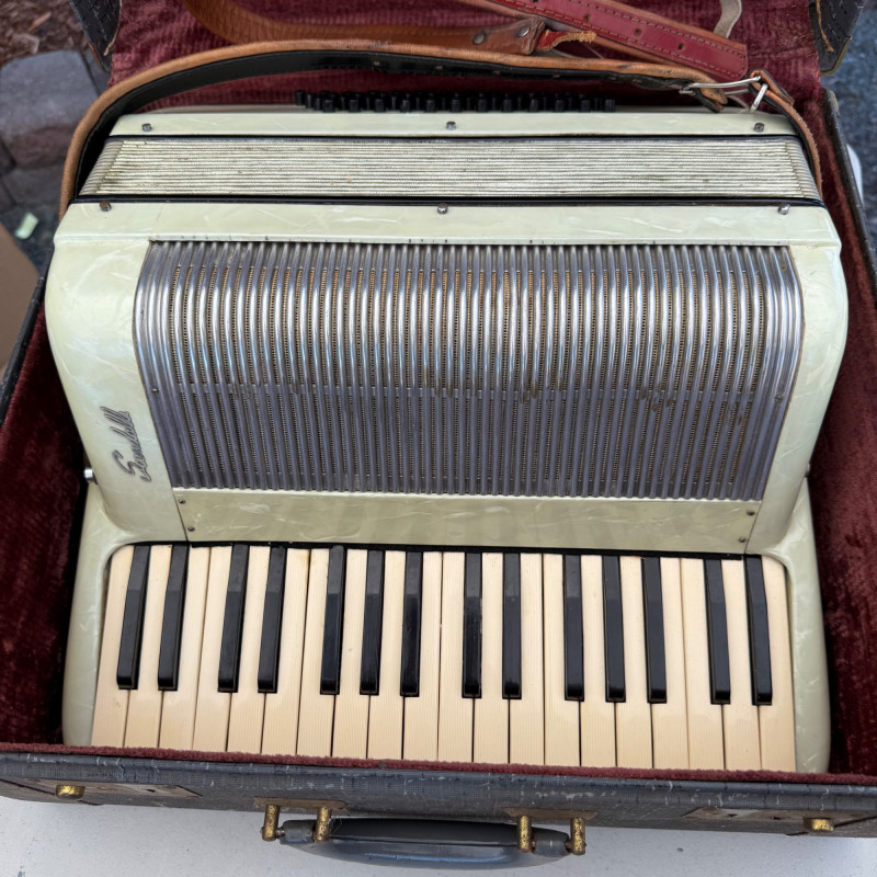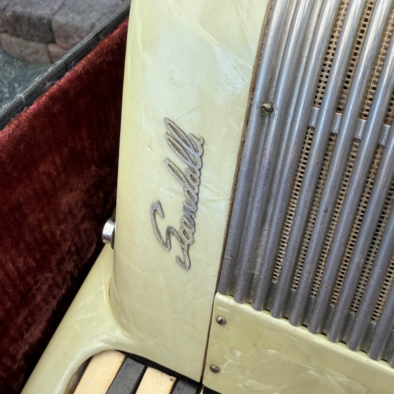 Scandalli Accordion – Italian Craftsmanship & Concert-Quality Sound Offered here is a beautifully crafted Scandalli accordion, a fine example from one of Italy’s most prestigious accordion makers. Renowned worldwide for their tonal richness, elegant design, and professional reliability, Scandalli accordionshave been favored by performers and educators alike since the company’s founding in the early 20th century. Brand: Scandalli (Made in Italy) Registers: [e.g., 5 treble / 3 bass switches – varies by model] Reeds: High-quality steel reeds for rich tonal clarity Tuning: Full, musette, or dry (depending on model) Construction: Durable wooden body with a high-gloss celluloid finish Bellows: Multi-fold bellows with reinforced corners and decorative paper Straps & Case: Includes adjustable shoulder straps and a hard or soft carrying case (if applicable) Key Features: