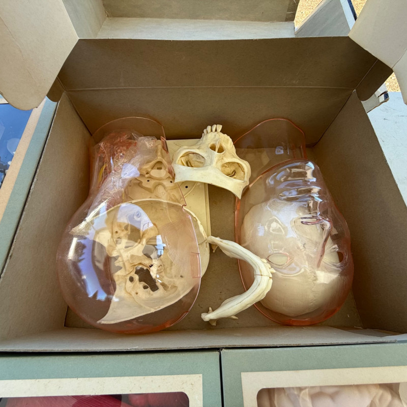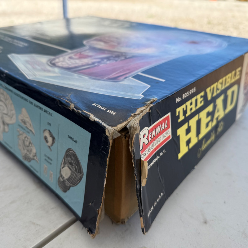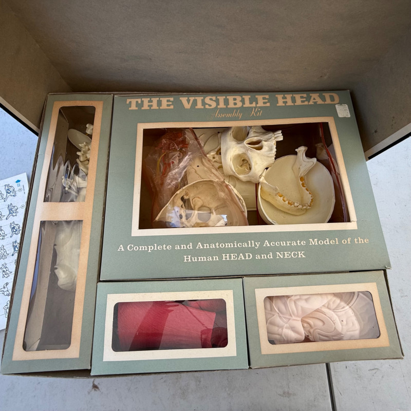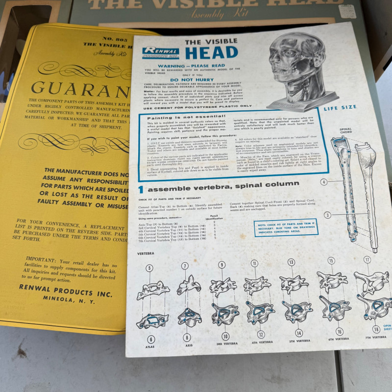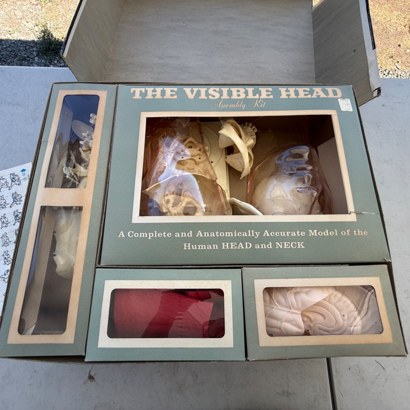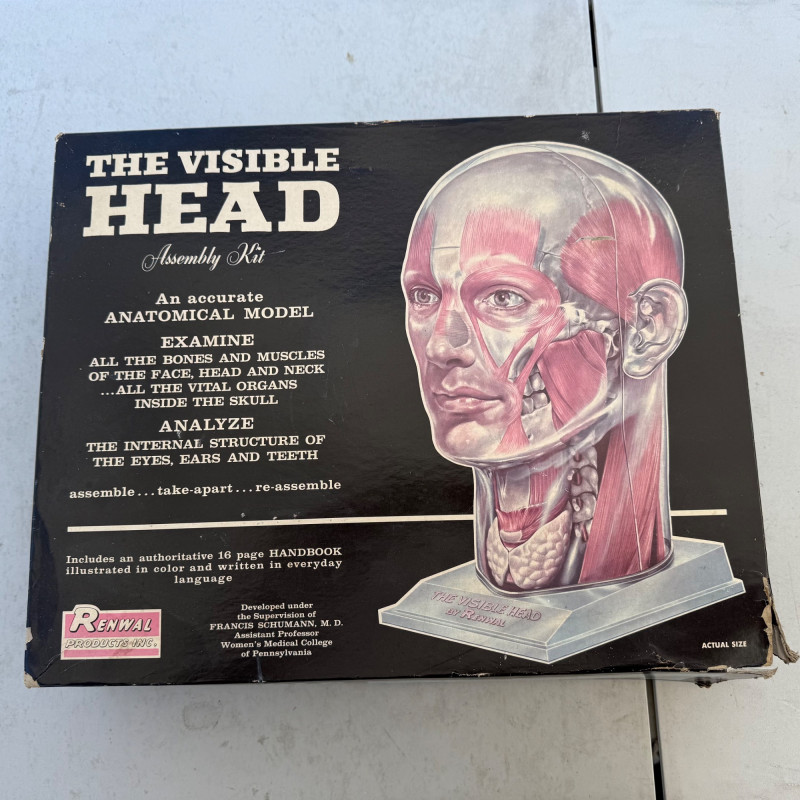Vintage Renwal “The Visible Head” Anatomical Model – Mid-Century Educational Science Kit This Vintage Renwal "The Visible Head" Anatomical Model is a fascinating mid-century educational tool designed to teach the structure of the human head and brain. Produced in the 1960s by Renwal, a leader in anatomical model kits, this clear plastic model features detailed, removable parts that allow for hands-on exploration of human cranial anatomy. Maker: Renwal Products, Inc. Model Name: “The Visible Head” Era: Circa 1960s Material: Transparent plastic shell with detailed inner components Includes: Brain hemispheres, inner ear, eye, sinus cavities, skull base, and other anatomical structures Display: Mounted on a stand for educational or display purposes