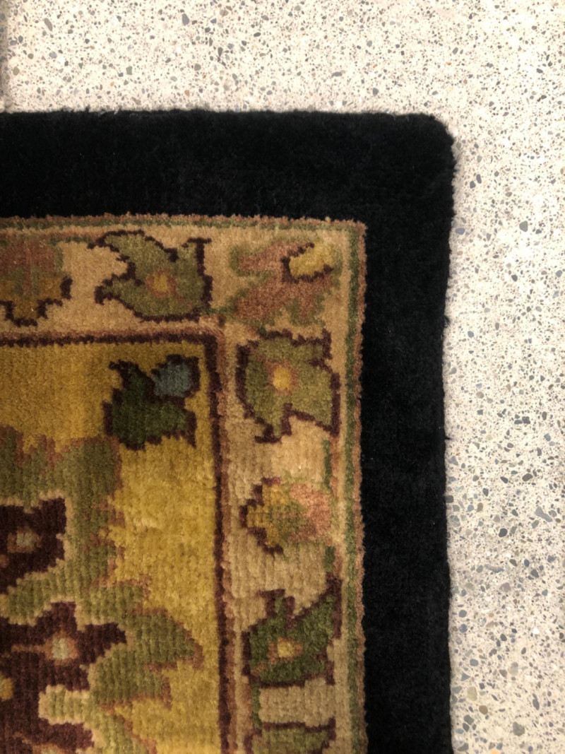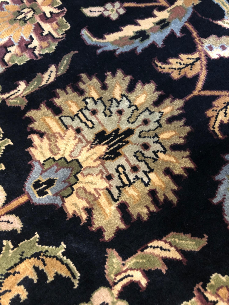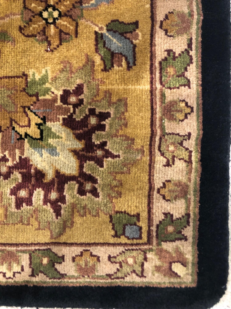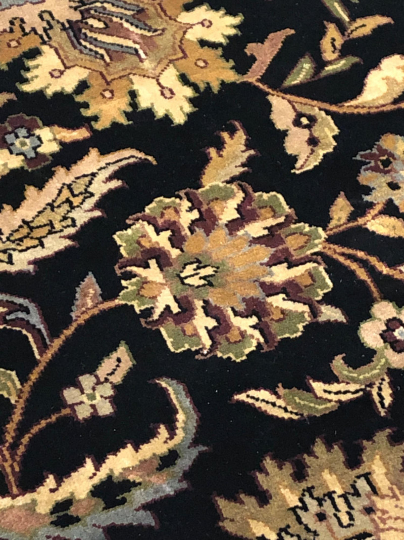 This handmade wool rug from the Mahar Collection showcases a traditional Indian floral design in tones of gold, tan, olive, and burgundy set against a deep black field. The wide border features an ornate complementary motif, enhancing the rug’s formal aesthetic. Crafted in India using time-honored techniques, this hand-tufted piece offers warmth, comfort, and timeless decorative appeal. Some light edge wear Wool construction, hand-tufted From the “Mahar” Collection, made in India Due to Size: This Item Is Not Eligible for Shipping. Available for Local Pickup Only.