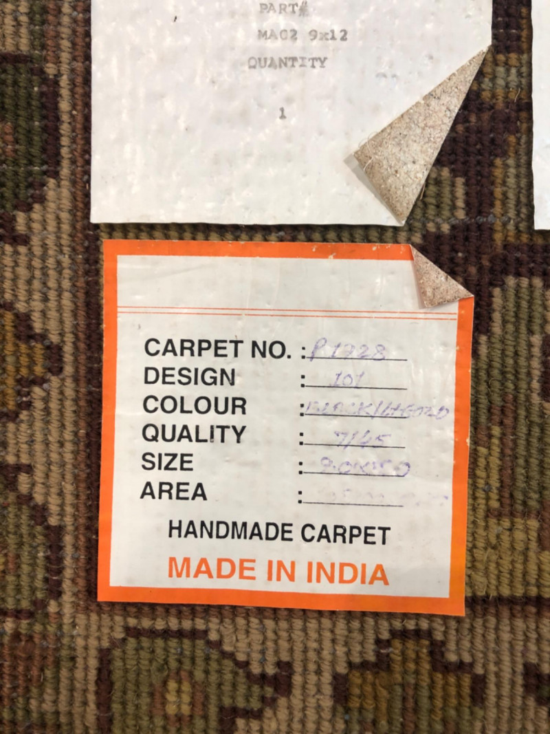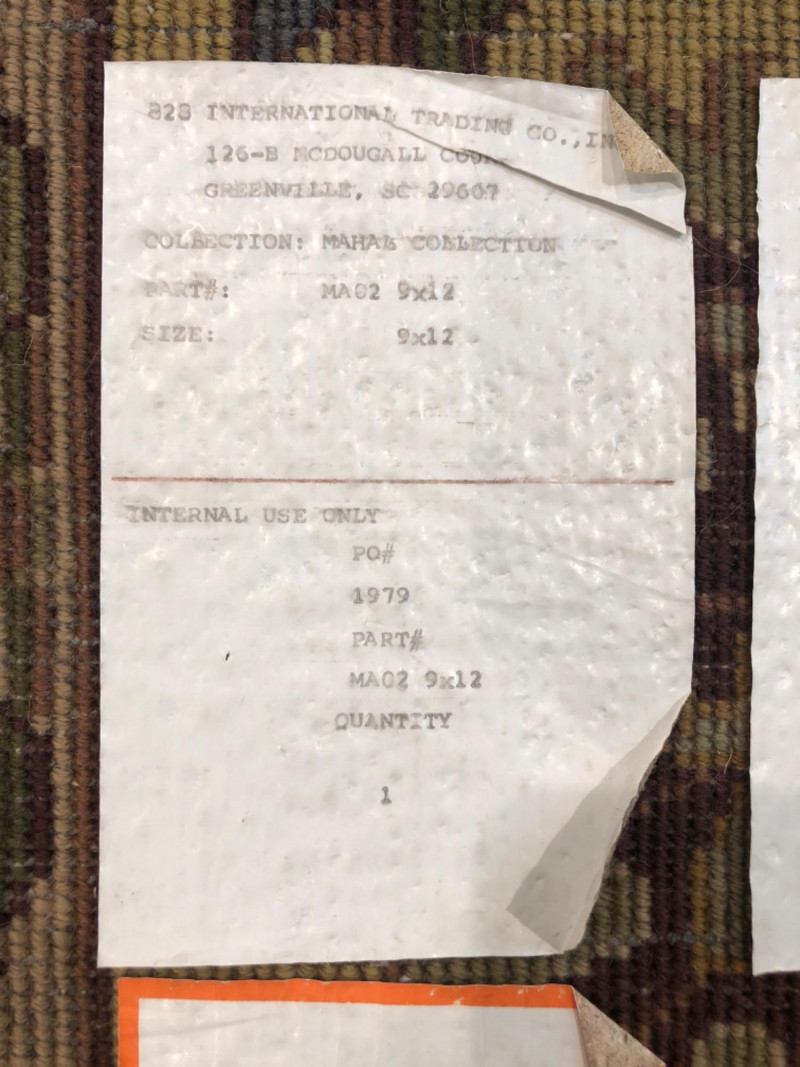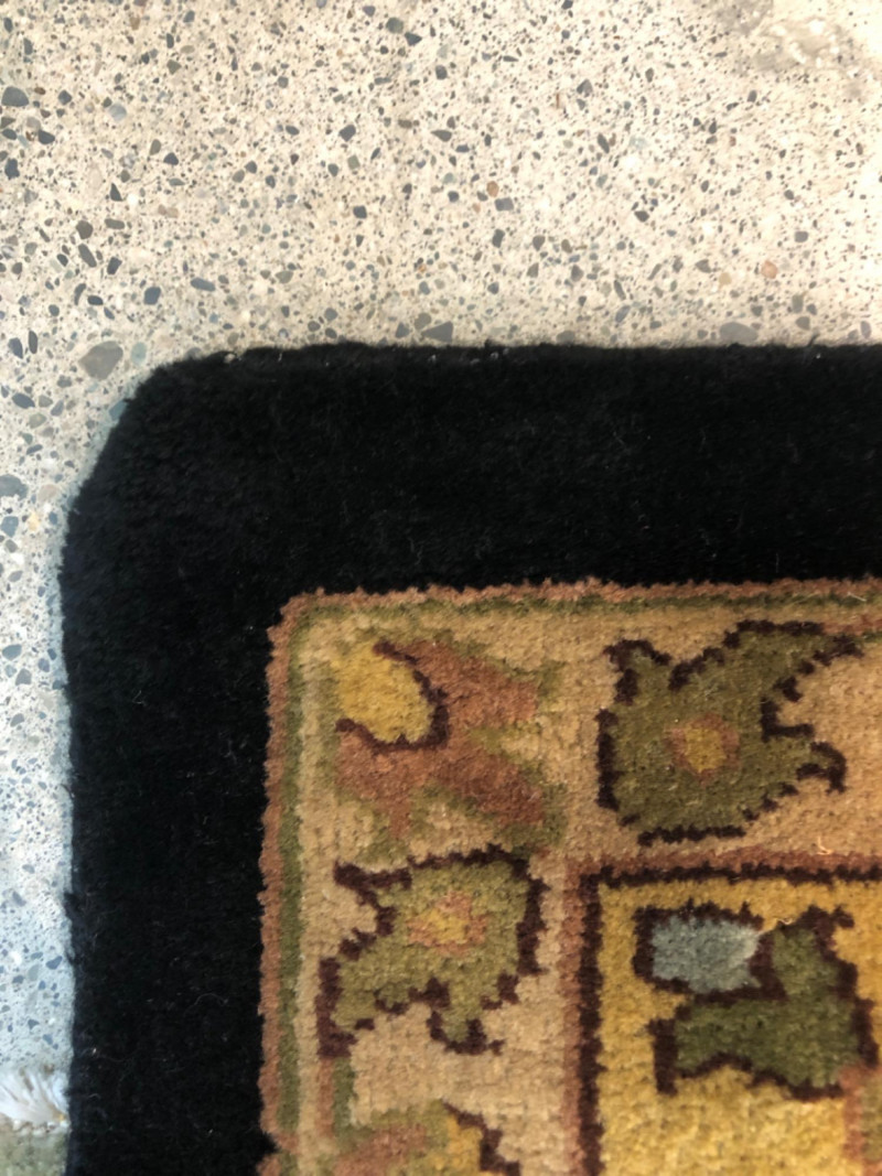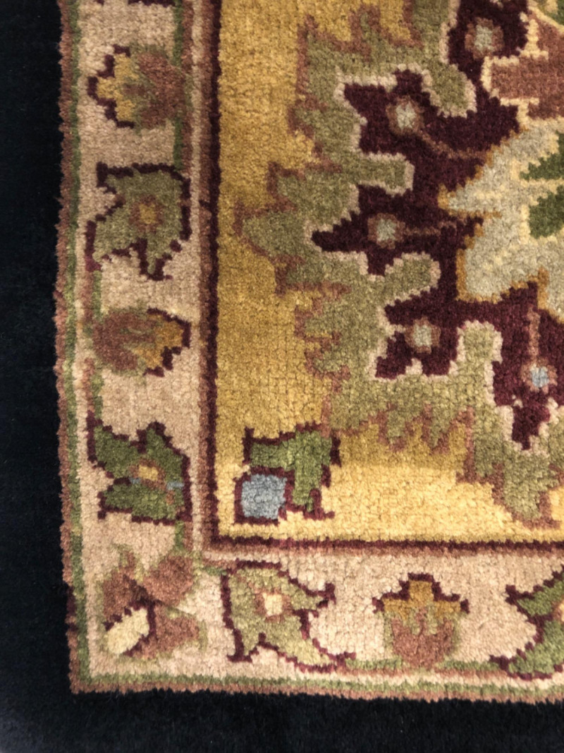 This handmade wool rug from the Mahar Collection showcases a traditional Indian floral design in tones of gold, tan, olive, and burgundy set against a deep black field. The wide border features an ornate complementary motif, enhancing the rug’s formal aesthetic. Crafted in India using time-honored techniques, this hand-tufted piece offers warmth, comfort, and timeless decorative appeal. Some light edge wear Wool construction, hand-tufted From the “Mahar” Collection, made in India Due to Size: This Item Is Not Eligible for Shipping. Available for Local Pickup Only.