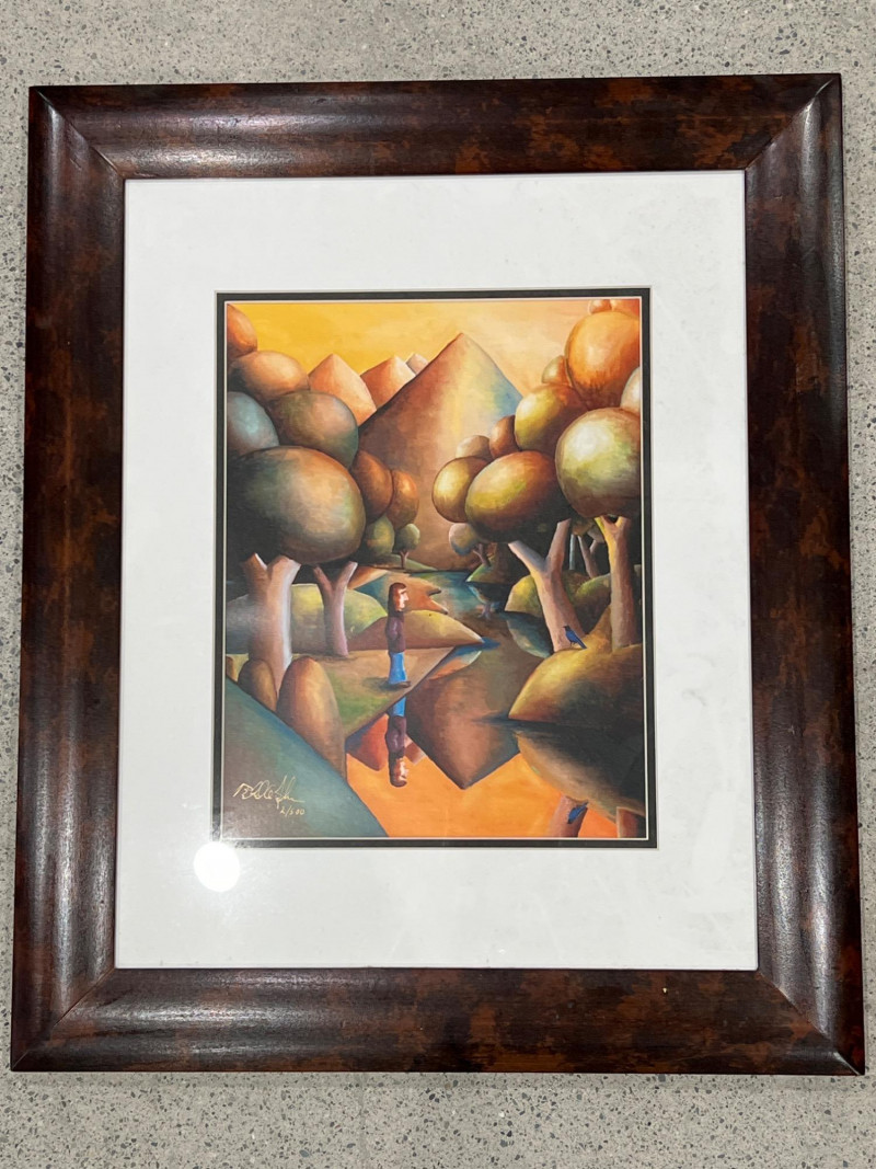 Vibrant and surreal, Reflections by Richard Jahn is a limited-edition lithograph that merges stylized landscape with meditative presence. Signed in print, and also with a personal signature in gold ink, this lithograph is numbered 2/500. His compelling work depicts a serene forest with rounded trees, gentle mountains, and a solitary figure mirrored in a still stream—echoing both visual reflection and introspective calm. Presented in a glossy wood frame with white matting, the piece delivers striking color and emotional stillness. A captivating addition to any contemporary, nature-inspired, or surrealist art collection. Hand-signed & a limited edition - number 2 of 500 Title: Reflections Artist: Richard Jahn Medium: Lithograph Frame: Glossy brown wood frame with white mat