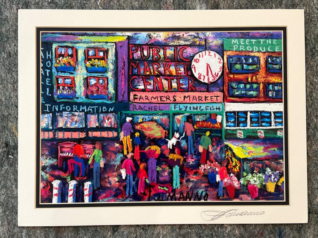 Lamanno began exhibiting at Pike Place in the late 1970s, with work appearing in posters, brochures, and private collections. This piece is a striking example of his lifelong connection to Seattle’s cultural heart.
