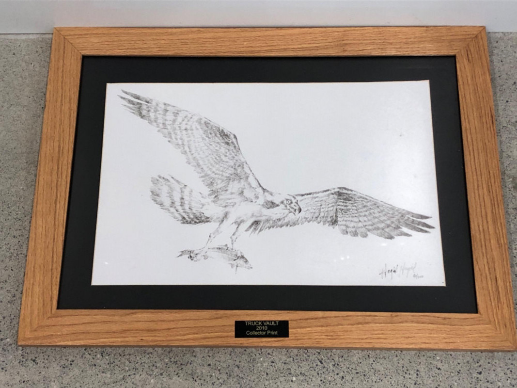 Black and white lithograph depicting an osprey mid-flight holding a fish, signed by the artist and numbered 40/200. This 2010 Truck Vault collector print is professionally framed with a black mat, wood frame, and brass title plaque.