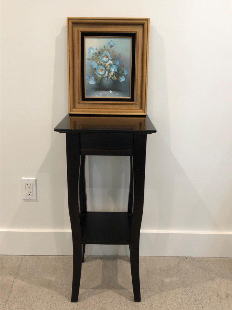 Framed still life painting featuring soft blue flowers in a vase, displayed on a black curved-leg pedestal table. The artwork is signed by the artist (name not confirmed). The canvas is framed in a gold and black wood frame.