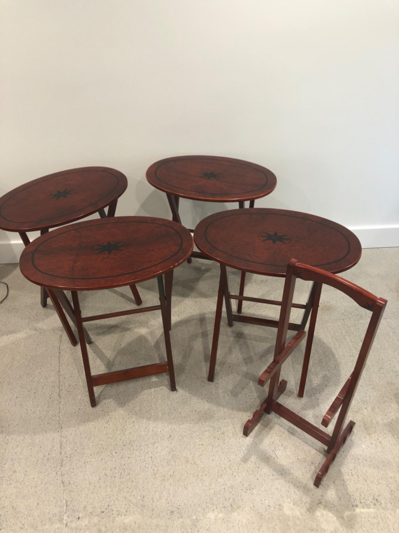 Set of four oval-shaped wooden TV trays featuring an inlaid black compass rose design and rich reddish-brown finish. Includes matching folding stand for compact storage. All trays are with functional folding mechanisms. Includes 4 folding trays and 1 stand Matching compass motif on each tray and stand Due to Size: This Item Is Not Eligible for Shipping. Available for Local Pickup Only.